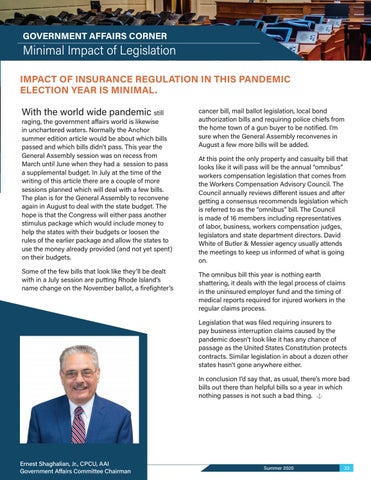 raging, the government affairs world is likewise in unchartered waters. Normally the Anchor summer edition article would be about which bills passed and which bills didn’t pass. This year the General Assembly session was on recess from March until June when they had a session to pass a supplemental budget. In July at the time of the writing of this article there are a couple of more sessions planned which will deal with a few bills. The plan is for the General Assembly to reconvene again in August to deal with the state budget. The hope is that the Congress will either pass another stimulus package which would include money to help the states with their budgets or loosen the rules of the earlier package and allow the states to use the money already provided (and not yet spent) on their budgets. Some of the few bills that look like they’ll be dealt with in a July session are putting Rhode Island’s name change on the November ballot, a firefighter’s