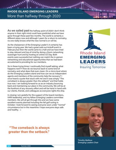 gone through these past few months. The world is certainly a different place now and although I yearn for a return to normalcy, no one really knows what the new normal is or will be. As the chairperson of the Emerging Leader’s it certainly has been a trying year. We had a great sold-out kickoff event in February but then the world came to a halt and we have tried to stay relevant and top of mind by doing a Zoom networking scavenger hunt and by hosting an online CE Day. Both events were successful but nothing can match the in-person networking and educational opportunities that we had been accustomed to providing for our members. So in these trying times I continually find myself asking, what happens next?? How do we bounce back to some kind of normalcy and what does that even mean. On a micro level where do the Emerging Leaders stand and how can we as independent agents and members of the community help the recovery? I once heard a quote that stuck with me and it was simply “The comeback is always greater than the setback” and that holds true now. I am looking forward to us as an industry bouncing back and maintaining our place in the community. We will be at the forefront of any recovery effort and will be hand in hand with our clients, friends, and colleagues as everyone rights the ship. In closing I am grateful for the support of the board members, IIARI leadership, and my fellow Emerging Leaders committee members. We will all get through this and we have some excellent events planned including the fall golf outing in October. I look forward to seeing everyone soon under “normal” circumstance but in the meantime I hope everyone stays safe and healthy.