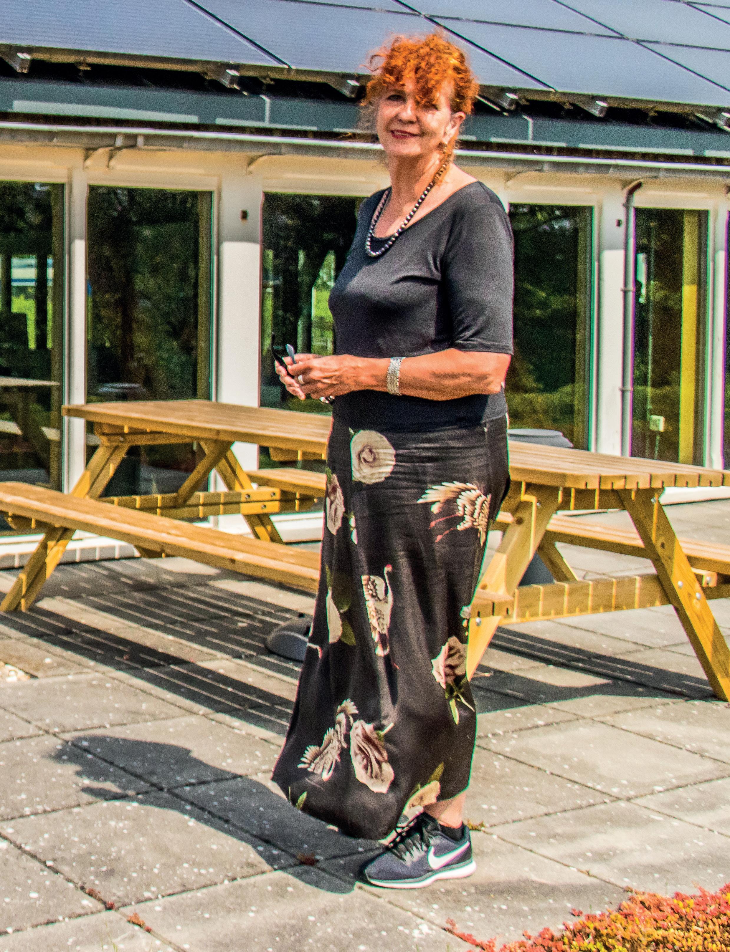 het restaureren, aan de zijkant wordt een oorspronkelijke toegang in een uitbouwtje weer als nieuw. Trots laat ze het gebouw zien, waar zeker ook de toepassingen van duurzaamheid opvallen. Er zijn zonnepanelen en op deze zonnige dag staat het isolerende sedumdak prachtig en vol kleur in bloei.