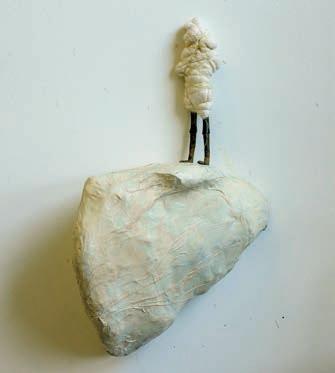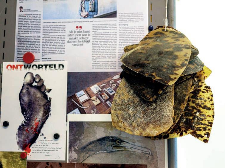Aan een wandrek in haar atelier hangen kleine delen schildpadhuid, ze heeft er schaapjes van gemaakt. Caroline wijst op een creatie aan de muur bij het raam. De schildpadhuid is de vacht van een schaapje, zijn kopje is geschilderd en in het midden van het lijf zit in rode verf een spijker waar het werkje aan bevestigd is. “Mooi detail, hè?” Daaronder hangt een figuur van papier-maché met beentjes van brons staand op een steen. “Ik heb een constante drang om te creëren. Als ik niets maak, word ik heel onrustig. Wat ik voel en beleef komt er via mijn handen uit, het is een gesprek. Ik kijk naar mijn werk, neem een paar stappen afstand, is het te heftig of juist te zwak? Als het klopt met mijn gevoel, kan ik daar heel blij van worden. Sommige werken zou ik nu anders maken. Ik schilder regelmatig oude schilderijen over met mijn technieken van nu. Ik heb er ook weleens spijt van, dan zie ik een foto van een ouder werk en denk: ‘zonde, dat was best mooi’. Het heeft ook te maken met hoe serieus je jezelf neemt, dat doe ik te weinig. Ik vraag me soms af wie er op mijn werk zit te wachten, eigenlijk wat onzeker. Het komt ook voor dat het overschilderen nieuwe effecten geeft. De eerdere lagen werken door, je bent ze niet echt kwijt. Misschien kom ik er juist wel verder door. Mijn werk is een soort metafoor van hoe ik in het leven sta.”