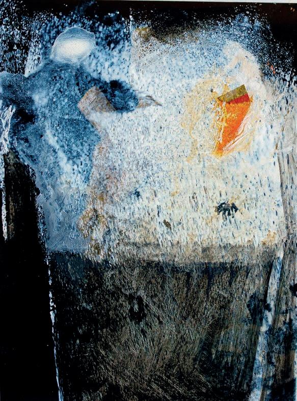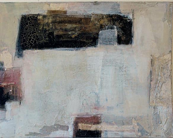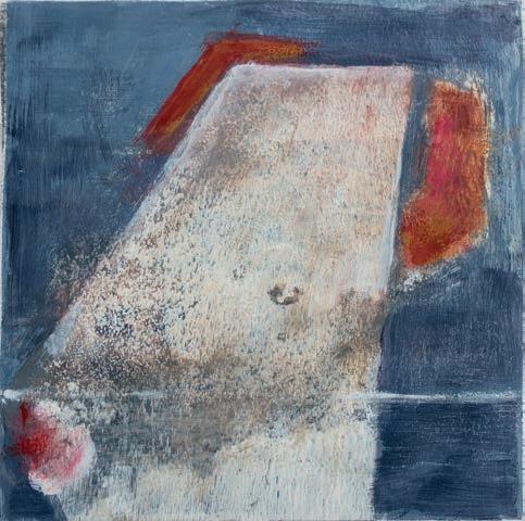 Ze gebruikt in haar werk meerdere materialen door elkaar. Caroline staat op en loopt naar een werk aan de wand. “Wat denk je dat dit is op de verf?” Het lijkt wol, maar het is een takje salie. Op het schilderij ernaast heeft ze met haar nagel strepen getrokken in een laag bijenwas op de verf. “Zo krijg je mooie lijnen, heerlijk om te doen.” Op weer een ander doek heeft de kunstenaar een stukje hout met papier en verf ingepakt. “Ik werk heel associatief. Soms kan je iets beter uitdrukken in hout, papier, wol of textiel. Het is verrassend om ze te combineren.