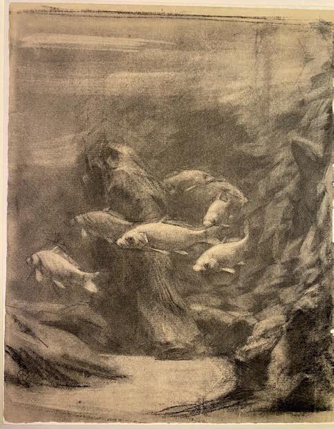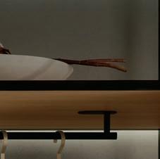 Caroline trekt een lade open van een tekenladenkast, vol met intrigerende spulletjes. Het waren lang haar inspiratiebronnen. Onder meer drie eendenkopjes, karton in honingraatvorm en een vogeltje in een oud naaidoosje. “Kijk dat nekje in die gebogen vorm, zo mooi!” Ook ligt er een oude linodruk van haaientanden. Ze pakt de haaienkaak van bovenop de kast en toont de rijen tanden. “Dit is toch prachtig! Een haai zal nooit zonder tanden zitten.” De kunstenaar neemt weer plaats en vervolgt: “Mijn werk gaat ook over het kind Caroline. Het oergevoel over mijn positie thuis aan tafel. Ik kom uit een talig gezin en was de jongste van vier kinderen. Aan de lange tafel zat mijn vader aan het hoofd, mijn zussen daarnaast en mijn broer tegenover mijn moeder. Ik zat als kleinste naast haar. Het centrum lag aan de andere kant van de tafel, daar was veel discussie. Ik vond dat moeilijk, ik had meer met beeld dan taal en