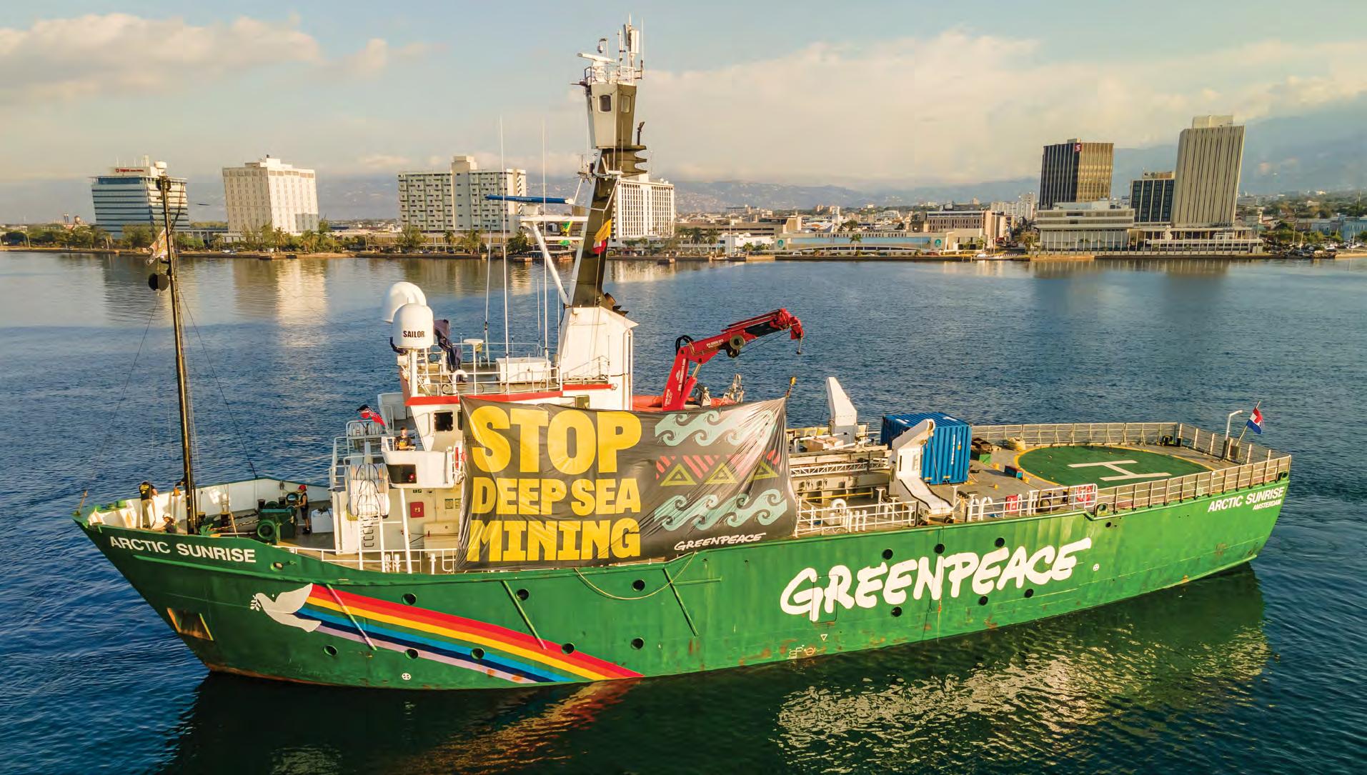 The Greenpeace ship Arctic Sunrise arrives in Kingston, Jamaica during ISA negotiations, March 2023, calling for a global moratorium on deep sea mining.