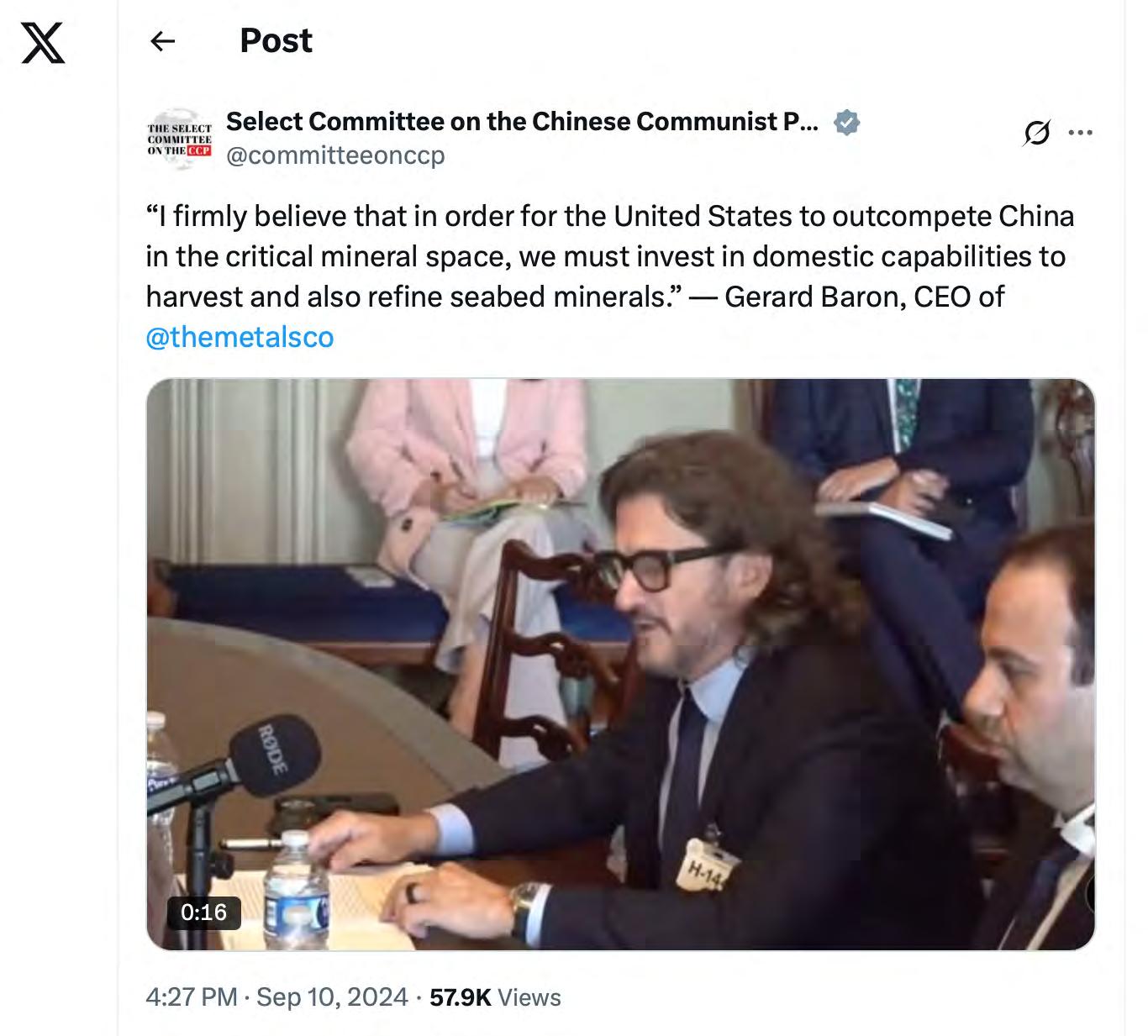Days before the Executive Order was signed, Barron posted a photo of himself leaving the White House, praising Trump’s new Tesla and alluding to his confidence in the administration’s direction. Just one week later, he was on Capitol Hill testifying before the U.S. House Natural Resources Subcommittee on Oversight and Investigations at a hearing entitled “Exploring the Potential of Deep Sea Mining to Expand American Mineral Production”, and once again hammering the theme that the U.S. should open deep sea mining to counter Chinese influence. On 29 April 2025, TMC submitted applications to NOAA for two exploration licenses and one recovery permit in international waters.8