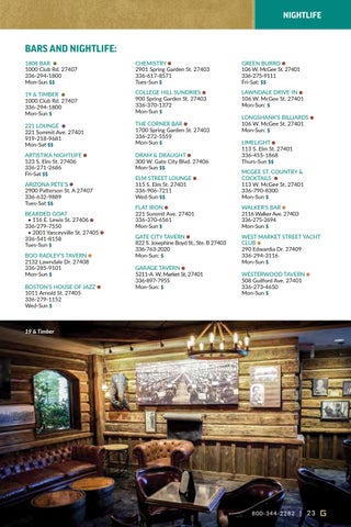 ARIZONA PETE’S 2900 Patterson St. A 27407 336-632-9889 Tues-Sat $$ BEARDED GOAT • 116 E. Lewis St. 27406 336-279-7550 • 2001 Yanceyville St. 27405 336-541-8158 Tues-Sun $ BOO RADLEY’S TAVERN 2132 Lawndale Dr. 27408 336-285-9101 Mon-Sun $ BOSTON’S HOUSE OF JAZZ 1011 Arnold St. 27405 336-279-1152 Wed-Sun $