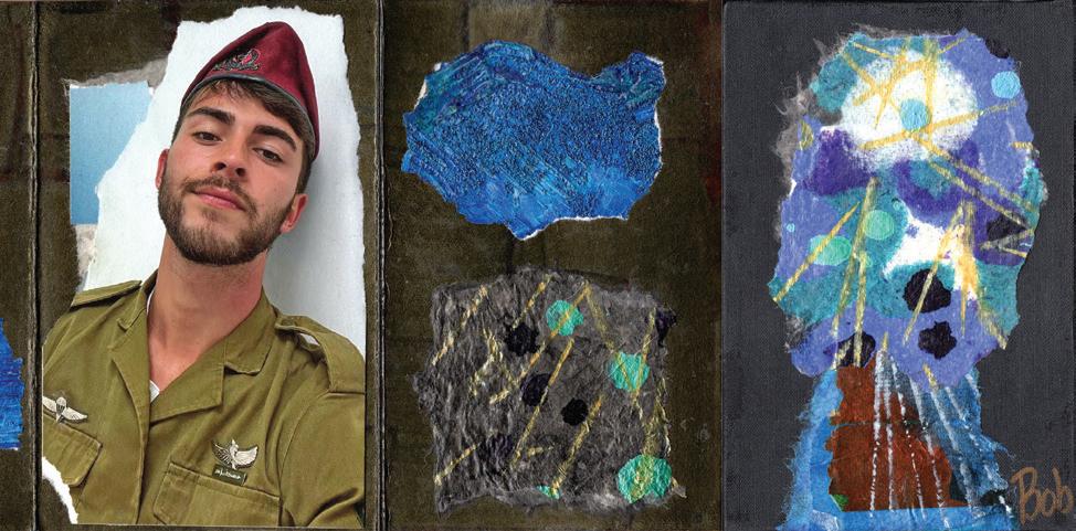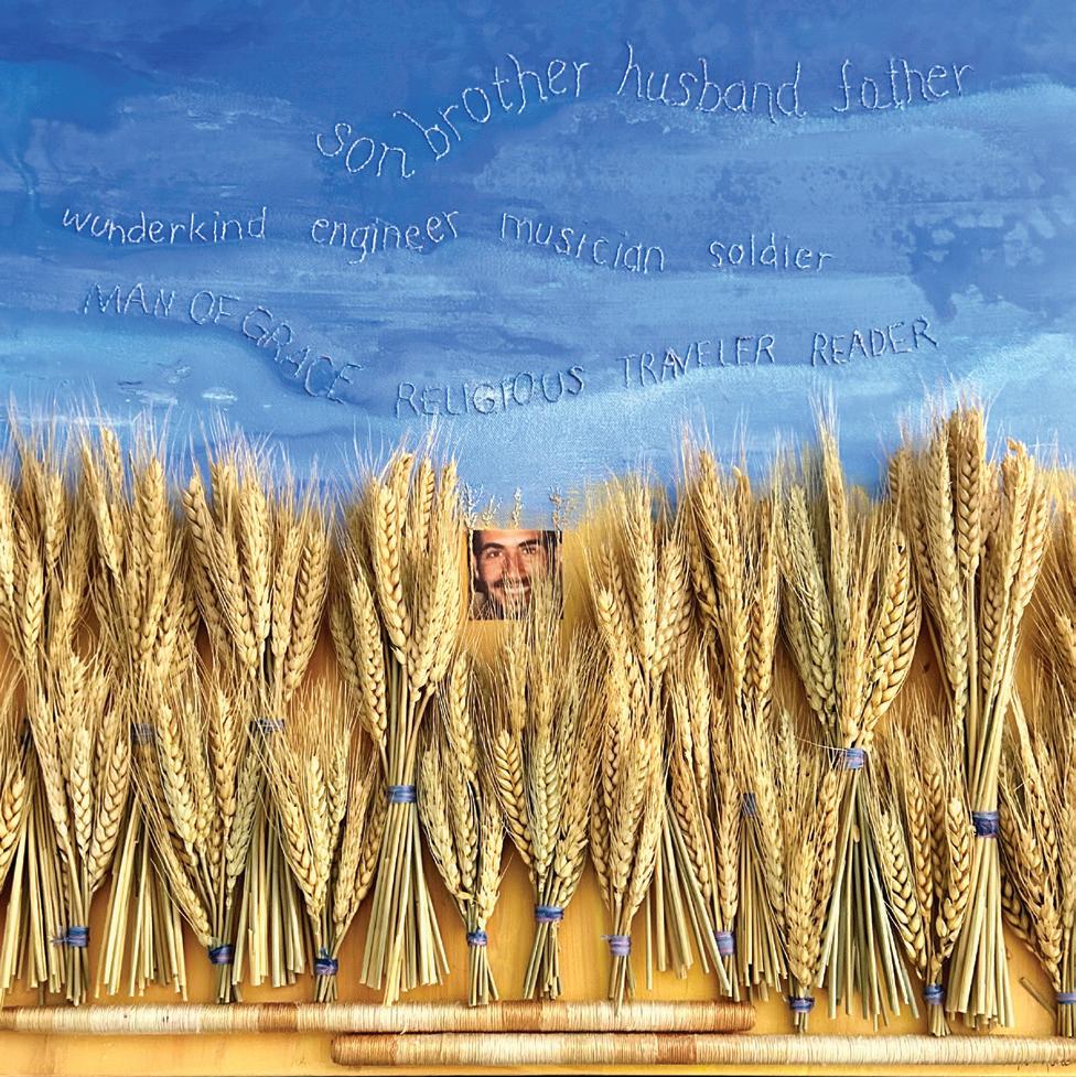 I tried to encompass what I learned in my multi-media portrait. The sky has sewn attributes. The first line says - son, brother, husband, father. The second line says – wunderkind, engineer, musician, soldier. And the last line says - a man of grace, religious, traveler, reader. The bottom half of the canvas has wheat, tied with blue embroidery threads that match the sky, and a photo of Avichai peeking out. He was killed on October 9th, in a field of wheat.