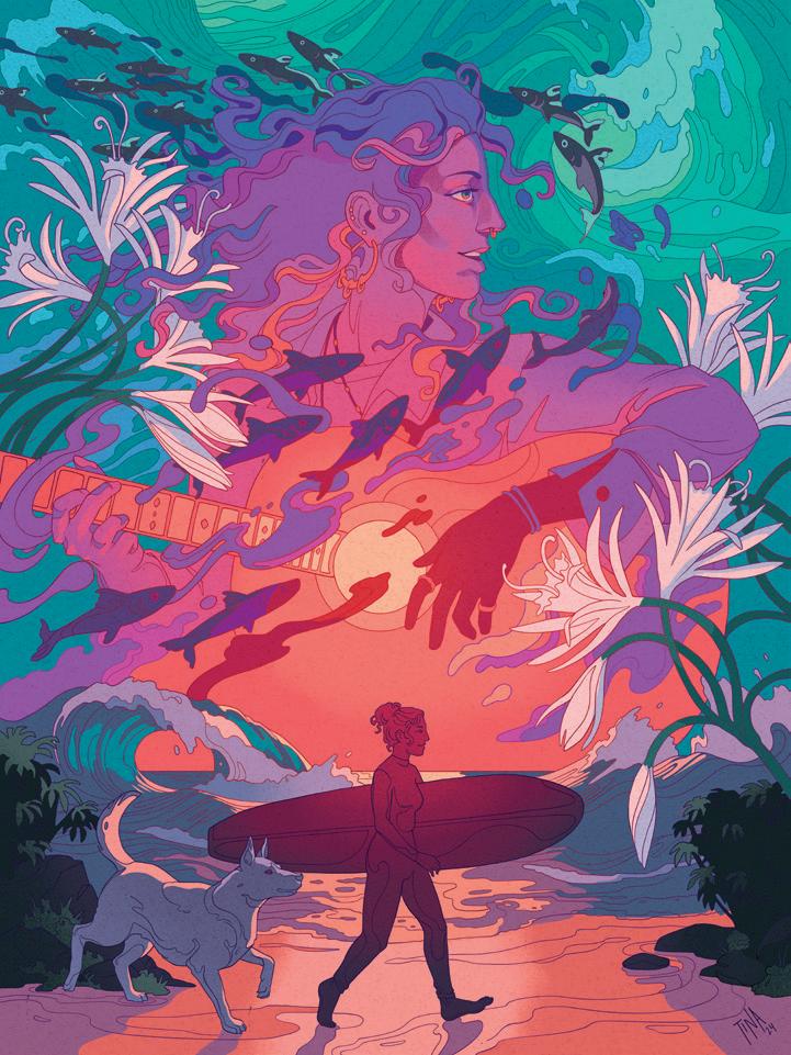 In my project I wish to convey not only her beautiful likeness, but also the beauty that she created and gave to the world with her music. My illustration is painted digitally, using a combination of somber greys, bright coral reds and turquoise blues. Her silhouette with a guitar will fade into a bright sunset over the ocean—Tamar’s favorite place—where she and her white Swiss shepherd descend from a rocky beach. Her likeness is implied, and her form intermingled with the clouds around a setting sun and coastal plants that sway in the breeze. The simple things she most enjoyed, music and nature, guide the process of
