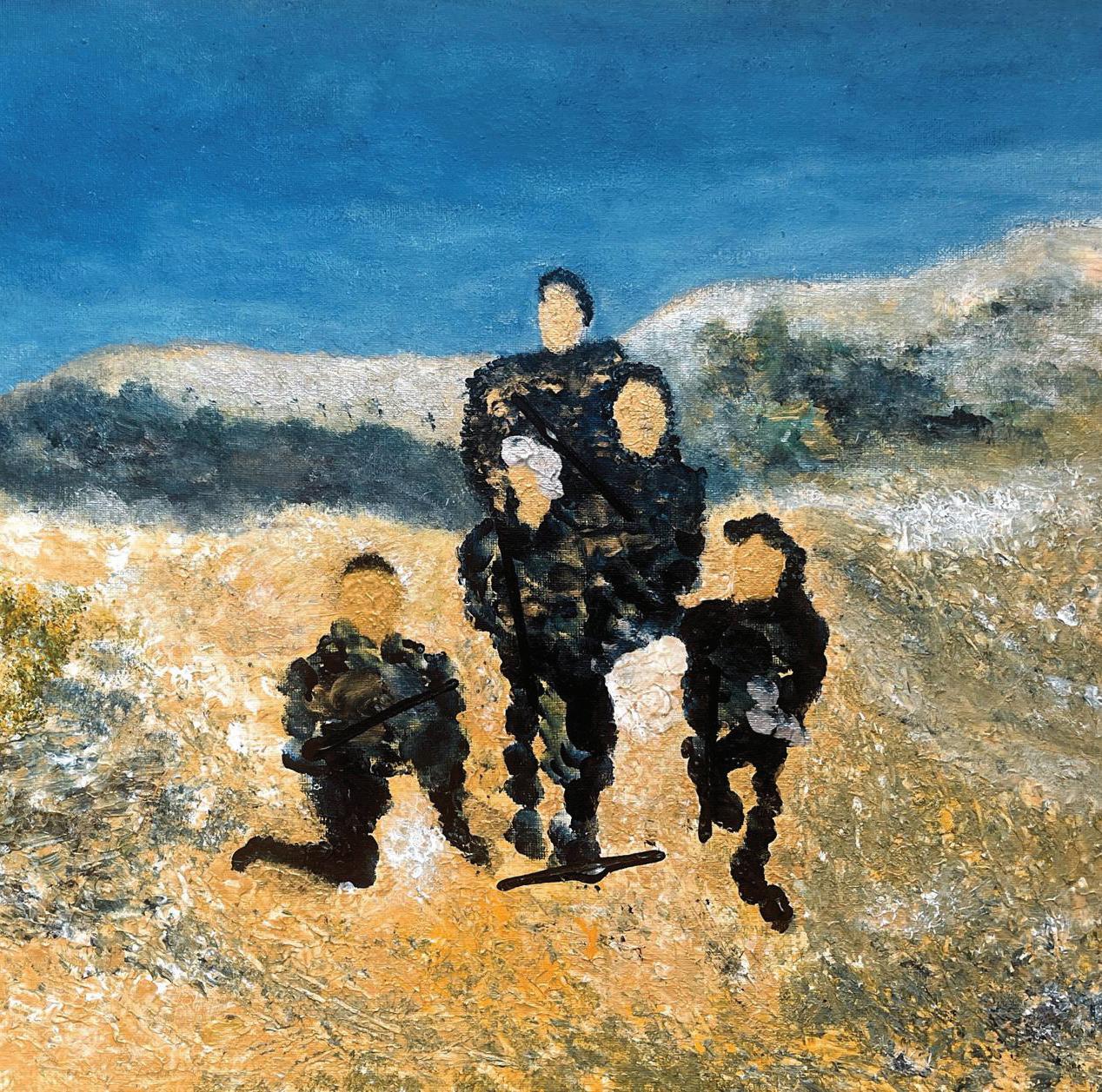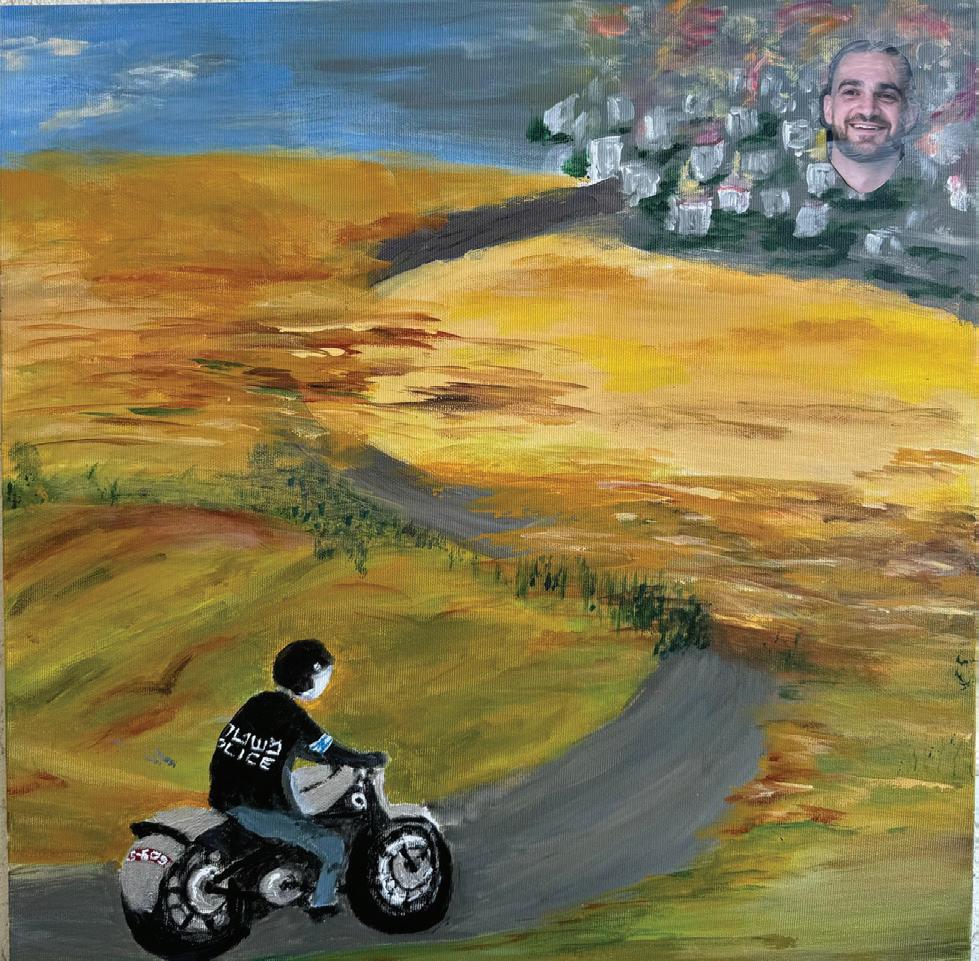 My painting is an expression of the intense emotions I felt following the conversation I had with his widow Eden. I thought about the beautiful landscape of our country that the late Eliran saw on the drive to Kibbutz Be’eri where his friends were murdered and their homes burned down. I empathized with the great loss and disaster that befell the family. I connected to the dream of Eden - in which Eliran looks down from above and knows everything, so I immortalized his beautiful smile at the top of the painting, looking down. Eliran liked to ride a motorcycle, so I drew him riding his motorcycle on October 7th from Tiberias in the north to Be’eri in the south.
