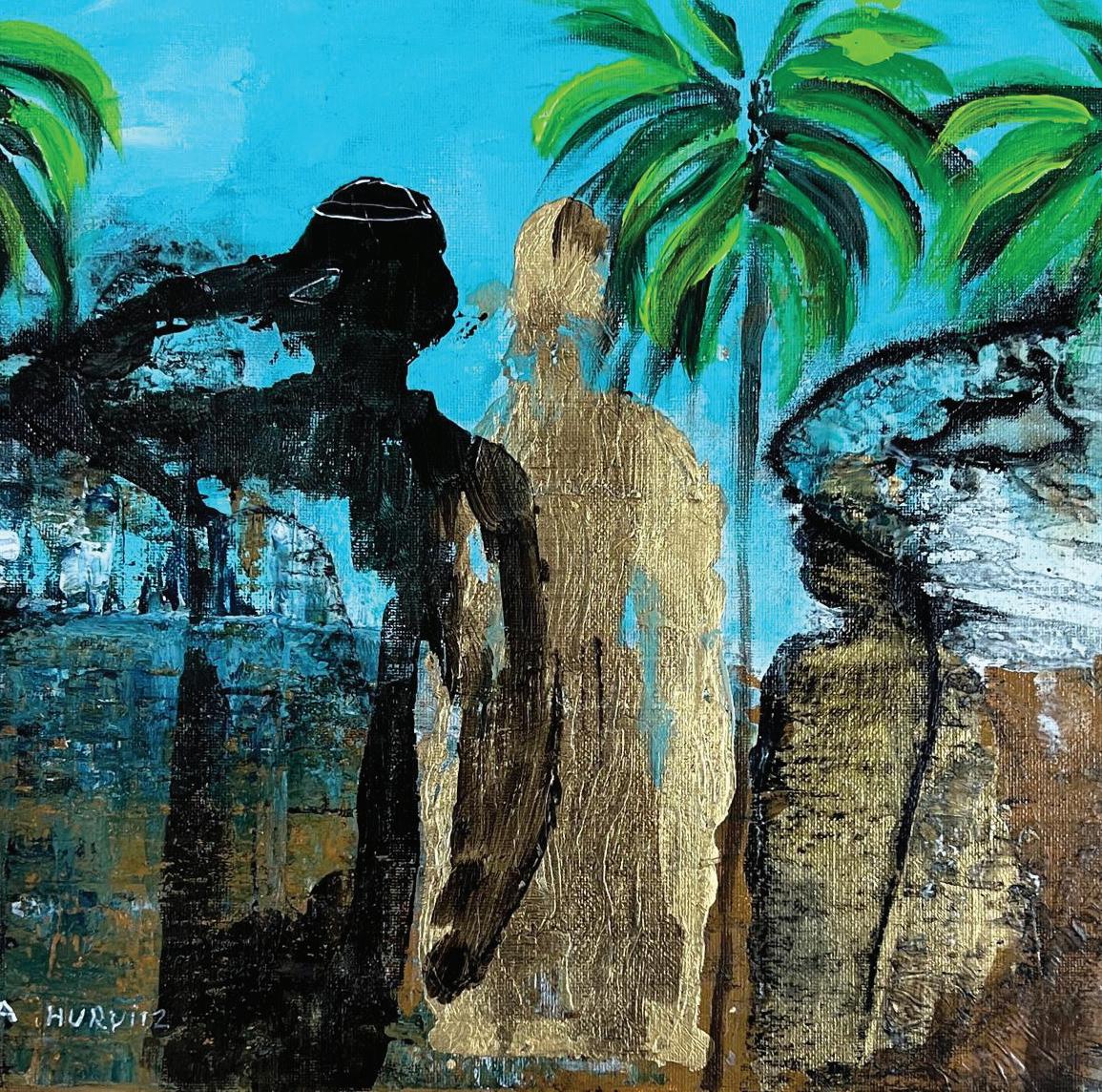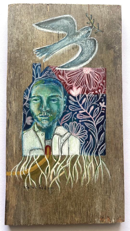 The colors for the background were inspired by her name, Agam—deep blue, reflecting her depth, transitioning into a shade of purple, a color that felt connected to her. At the center of the painting are two figures, expressing Agam’s compassion and her capacity to embrace, as well as her desire to help and care for people dealing with mental and physical challenges. I painted Agam as an angel, as that’s how she was in life.