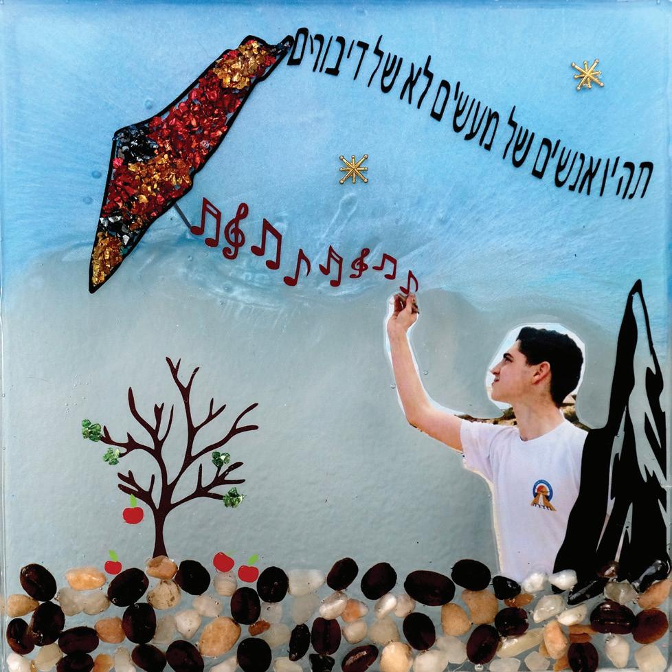 In my creation, I painted with acrylic colors and added texture with American putty. Above the piece, I wrote a verse in memory of Avichai, using pen and ink. I was inspired by the story of Avihai who grew up in the city, was educated in the religious sector, and was a member of the Bnei Akiva youth movement where I was also brought up with the same values.