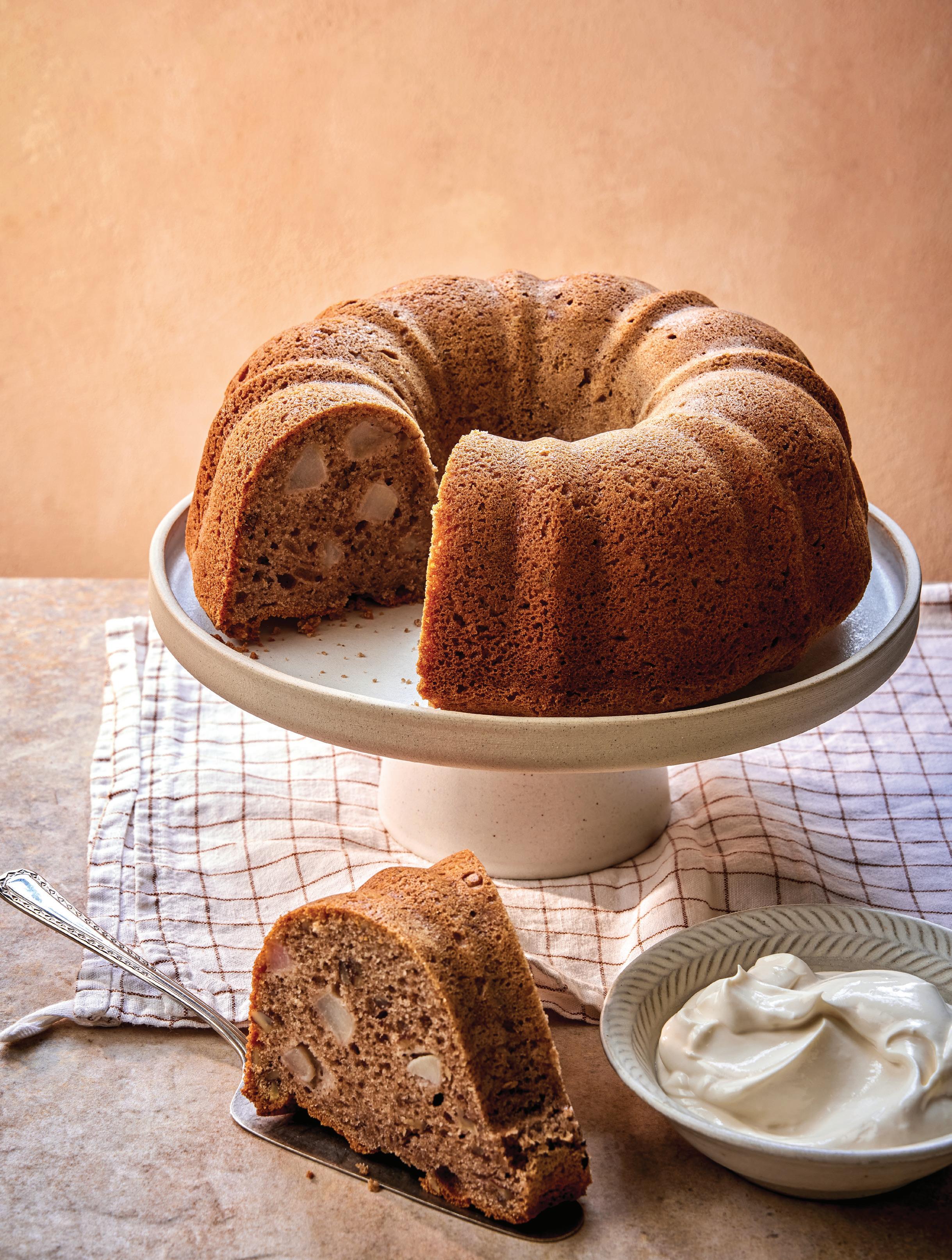 6. Swirl the chestnut spread through the crème fraîche and serve with the cake, lightly dusted with powdered sugar, if desired.