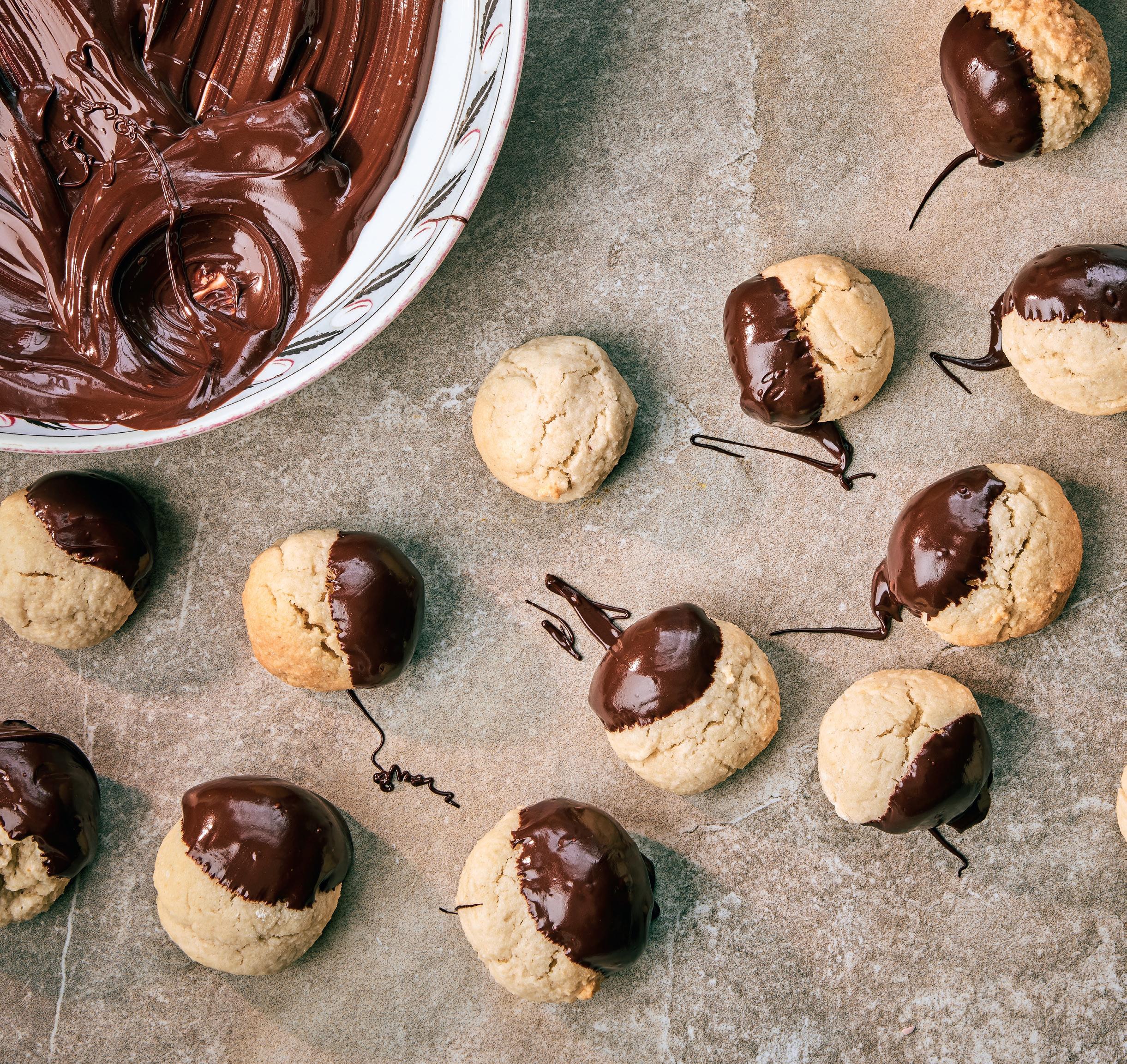 5. Melt the chocolate and butter in a heatproof bowl set over a pan of simmering water. Half-dip the Amaretti in the melted chocolate and leave to set. Enjoy with an espresso.