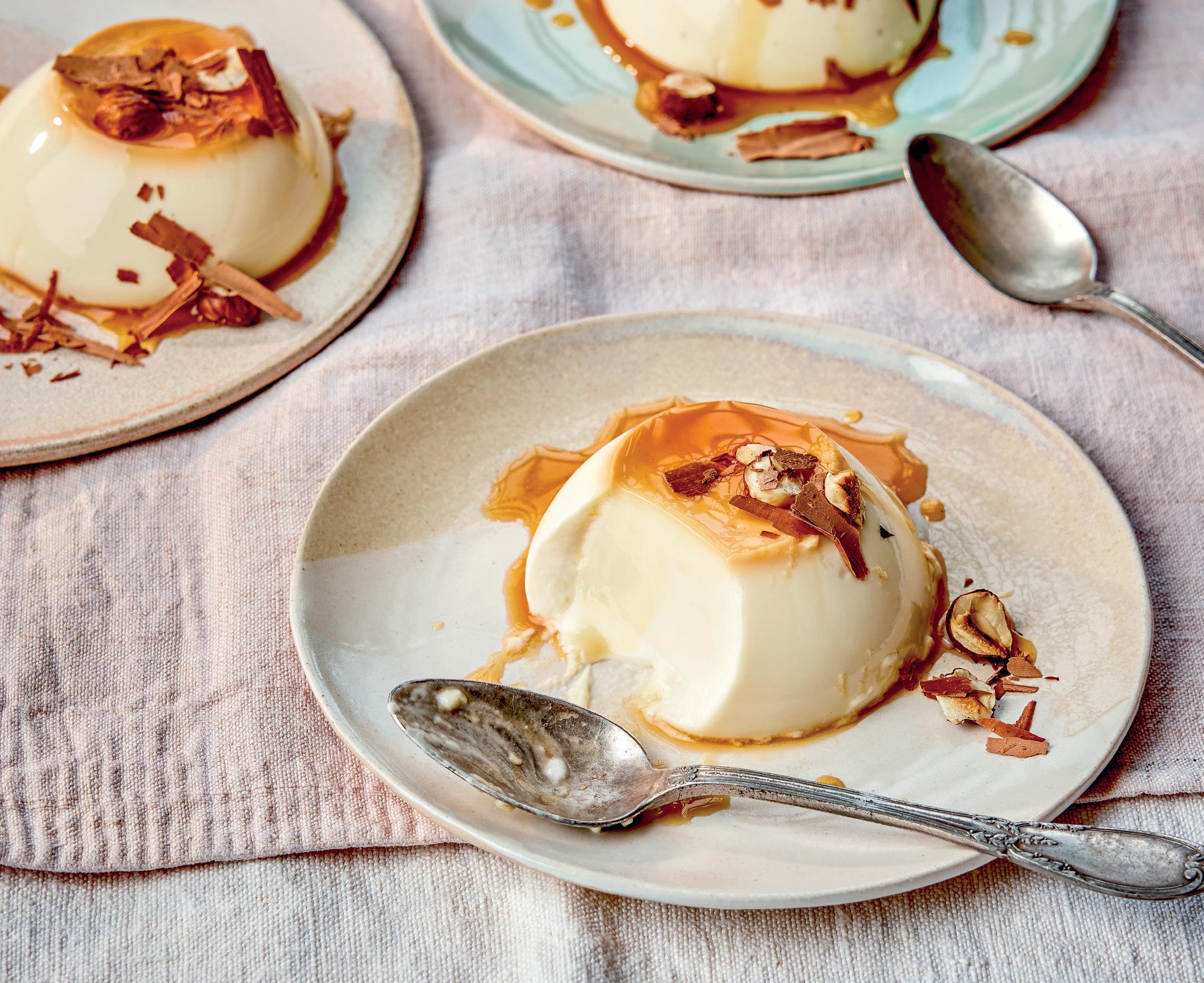 8. Turn the individual panna cottas out on to serving plates (or turn out from the loaf pan and cut into slices) and serve topped with crushed toasted hazelnuts, chocolate shavings, and any of the syrup from the mold drizzled over the top.