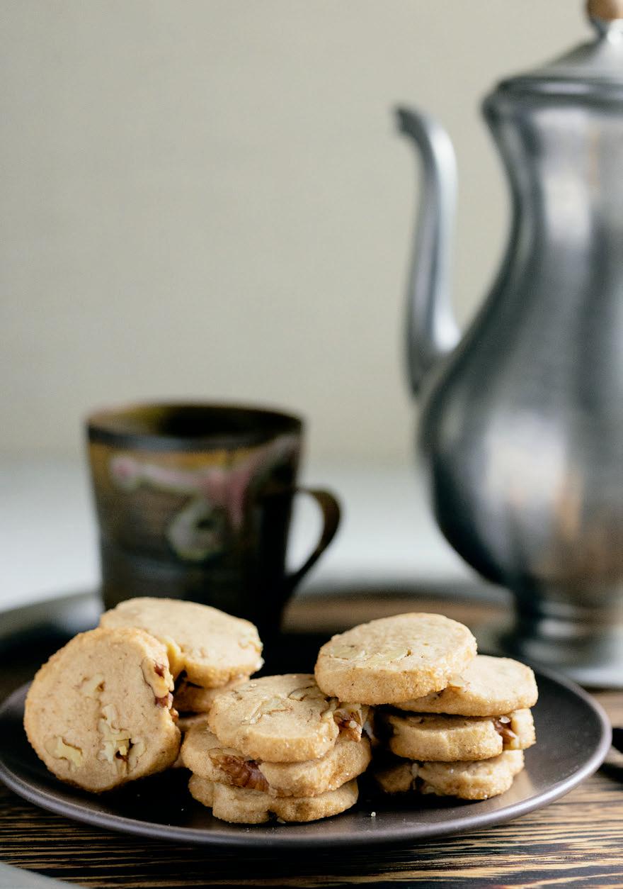 “My Granny Neal always made this espresso shortbread around the holidays. It’s studded with hunks of walnuts, and the specks of espresso give the shortbread a rich, bold flavor and an elegant look. I remember my aunt Kristin, who is a huge fan of shortbread, always munching on these. But, in recent years, she admitted to me that she always thought Granny Neal could have used a little more sugar in her shortbread. So, in Kristin’s honor, I upped the sugar content, and it was a great idea, as it balances out the espresso and brings out the richness of the butter even more. This cookie always makes me nostalgic and brings up memories of the holiday season, but it’s wonderful any time of the year.” [See recipe at right.]