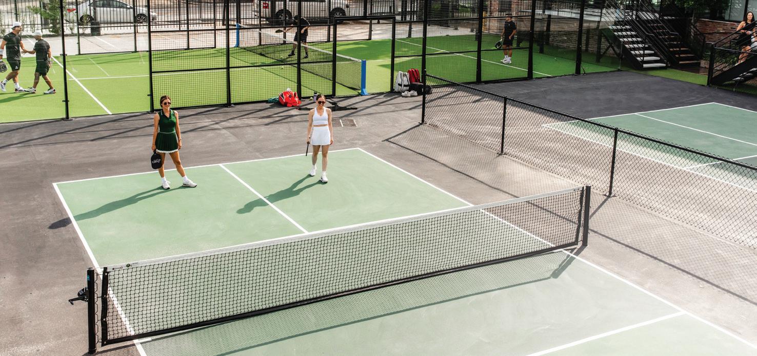 Solarium opened in April in Houston’s Midtown neighborhood and houses a racket sports-inspired lounge with a restaurant, bar, and patio, in addition to four outdoor pickleball courts and two outdoor padel courts (a racquet sport similar to pickleball).