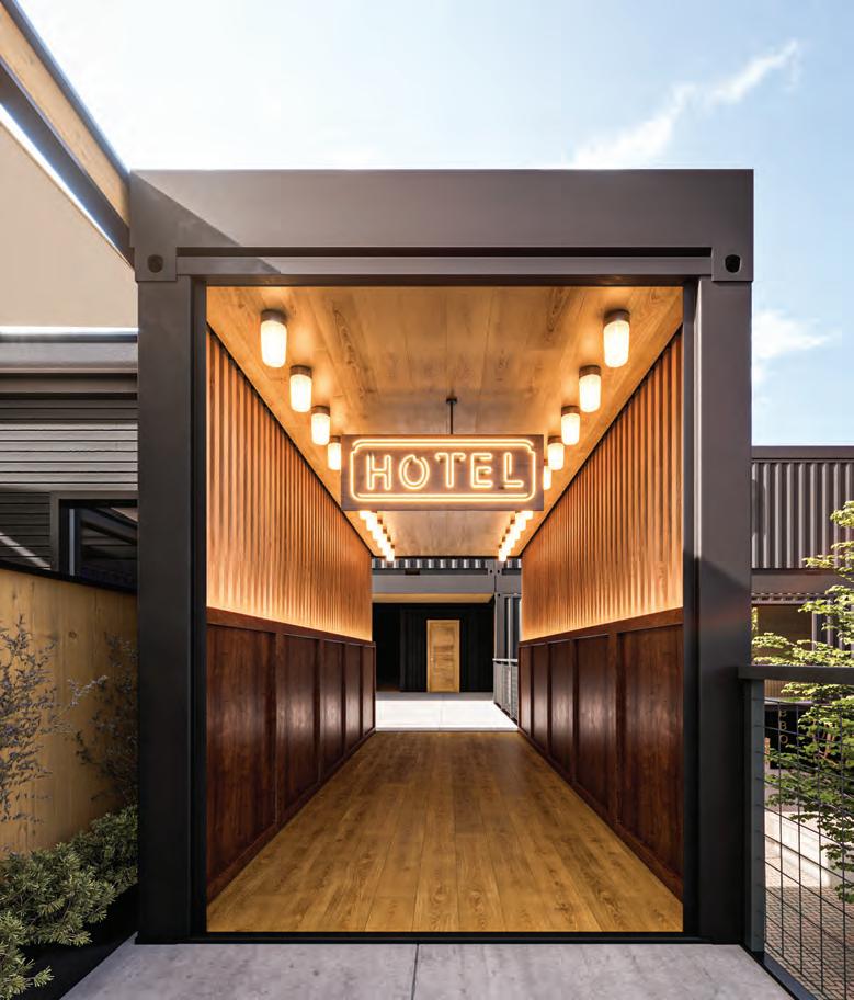 issues. Lucky Find stepped in and acquired the project from the bank that took possession. The design for the new space, which uses 100 shipping containers measuring 40 feet by 8 feet each, creates a communal courtyard. Each hotel room is made up of three to four containers, making for spacious accommodations.