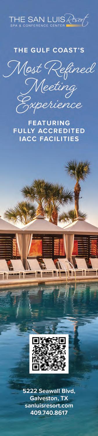 AUSTIN SCHMELZLE AUDIENCE DEVELOPMENT DIRECTOR GERI WILSON AUDIENCE DEVELOPMENT MANAGER CINDY FISH REPRINTS For high-quality reprints of 500 or more, call 612-371-5849 or email danderson@greenspring.com. For address changes, ordering single copies, cancellations, or general questions about your subscription, please contact customer service at 866-660-6247. 9401 James Ave. S., Suite 152, Bloomington, MN 55431 Phone 612-371-5800 Fax 612-371-5801 HOUR MEDIA CEO STEFAN WANCZYK PRESIDENT JOHN BALARDO The pages between the covers of this magazine (except for any inserted material) are made from wood fiber that was procured from forests that are sustainably managed to remain healthy, productive, and biologically diverse. Texas Meetings + Events is published quarterly. © 2023 Greenspring Media. All rights reserved. PRINTED IN THE U.S.A. PHOTOS (FROM ABOVE) Maggie Kirkland, City of Fort Worth EDITO R ’S NOTE