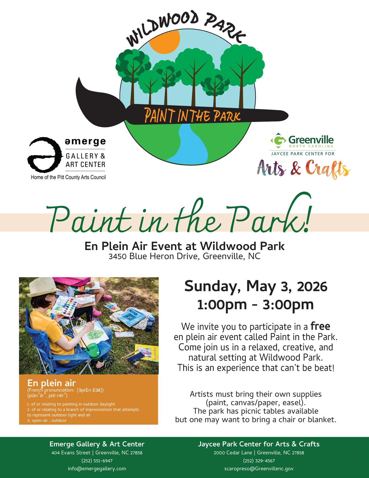Join us in a relaxed, creative, and natural setting at Wildwood Park. Artists will enjoy the natural ambiance of Wildwood Park (3450 Blue Heron Dr., Greenville, NC) and Barber Lake. Whether you are a novice or experienced painter, a great time is sure to be had, while meeting other creatives in Pitt County. No preregistration required.
