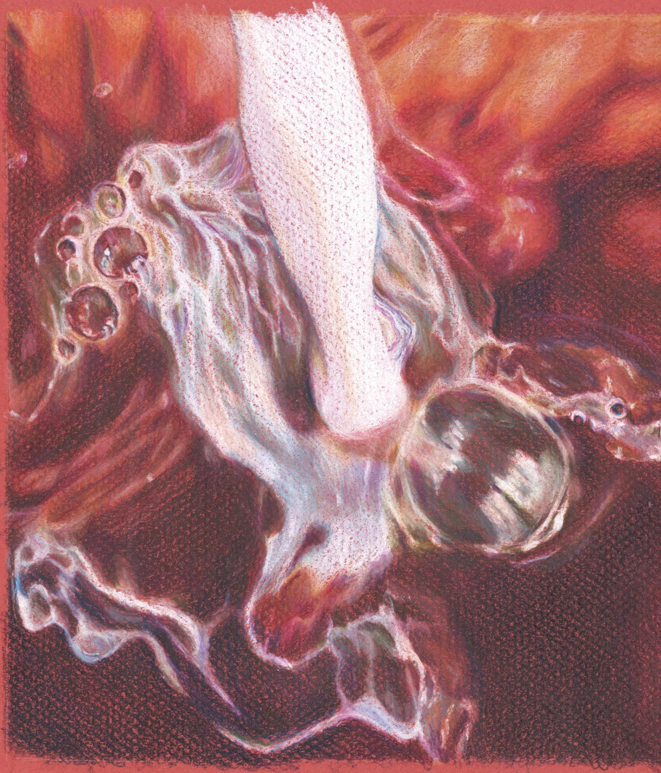 Like a feather in a pool of water we drift slowly apart without even saying a word, as if by coincidence we grew up and became women. I remember that one night when you left the tap on— you were incredibly ungraceful, as if you had spent the night at the bar. Past ten o’clock, you stood on two stools trying not to get your socks wet with water. Now, we drift like nothing through your mind, until there is no more water left.