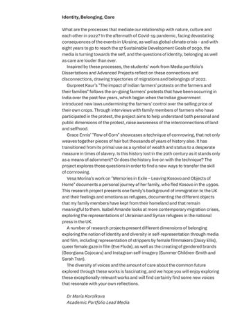 Identity, Belonging, Care What are the processes that mediate our relationship with nature, culture and each other in 2022? In the aftermath of Covid-19 pandemic, facing devastating consequences of the events in Ukraine, as well as global climate crisis – and with eight years to go to reach the 17 Sustainable Development Goals of 2030, the media is turning towards the self, and the questions of identity, belonging as well as care are louder than ever. Inspired by these processes, the students’ work from Media portfolio’s Dissertations and Advanced Projects reflect on these connections and disconnections, drawing trajectories of migrations and belongings of 2022. Gurpreet Kaur’s "The impact of Indian farmers' protests on the farmers and their families" follows the on-going farmers' protests that have been occurring in India over the past few years, which began when the Indian government introduced new laws undermining the farmers' control over the selling price of their own crops. Through interviews with family members of farmers who have participated in the protest, the project aims to help understand both personal and public dimensions of the protest, raise awareness of the interconnections of land and selfhood. Grace Ennis’ "Row of Corn" showcases a technique of cornrowing, that not only weaves together pieces of hair but thousands of years of history also. It has transitioned from its primal use as a symbol of wealth and status to a desperate measure in times of slavery. Is this history lost in the 20th century as it stands only as a means of adornment? Or does the history live on with the technique? The project explores those questions in order to find a new ways to transfer the skill of cornrowing. Vesa Morina’s work on "Memories in Exile – Leaving Kosovo and Objects of Home" documents a personal journey of her family, who fled Kosovo in the 1990s. This research project presents one family’s background of immigration to the UK and their feelings and emotions as refugees, documenting the different objects that my family members have kept from their homeland and that remain meaningful to them. Isabel Amande looks at more contemporary migration crises, exploring the representations of Ukrainian and Syrian refugees in the national press in the UK. A number of research projects present different dimensions of belonging exploring the notion of identity and diversity in self-representation through media and film, including representation of strippers by female filmmakers (Daisy Ellis), queer female gaze in film (Eve Flude), as well as the creating of gendered brands (Georgiana Cojocaru) and Instagram self-imagery (Summer Children-Smith and Sarah Tran). The diversity of voices and the amount of care about the common future explored through these works is fascinating, and we hope you will enjoy exploring these exceptionally relevant works and will find certainly find some new voices that resonate with your own reflections. Dr Maria Korolkova Academic Portfolio Lead Media