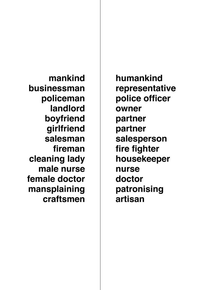 While the way we experience gender could initially be thought of as an internal experience, our surroundings and actions are likely to affect it to some degree. From that arises the question of how different things might affect how we experience gender. Specifically, how does visual language and linguistics influence us, and how can we challenge it? By looking both at the language we use and are surrounded with, both in terms of the words we choose and the structure of the language we speak, the project explores the impact this has on how we experience gender.