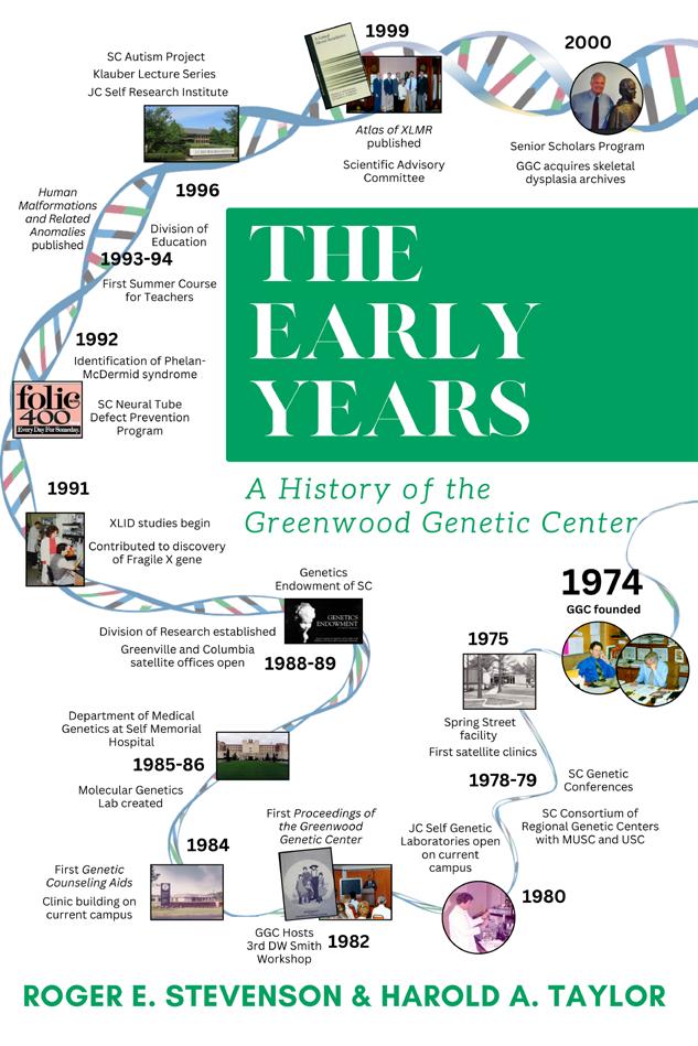 If you want to learn more about GGC’s history, GGC cofounders, Roger Stevenson, MD, and Hal Taylor, PhD, have captured their memories, stories, and the many accomplishments of the Center’s first 25 years in a new book, The Early Years: A History of the Greenwood Genetic Center. This account reviews the events that led to the creation of GGC along with patient stories and many colorful anecdotes that shaped GGC into the unique and successful organization that it has become.