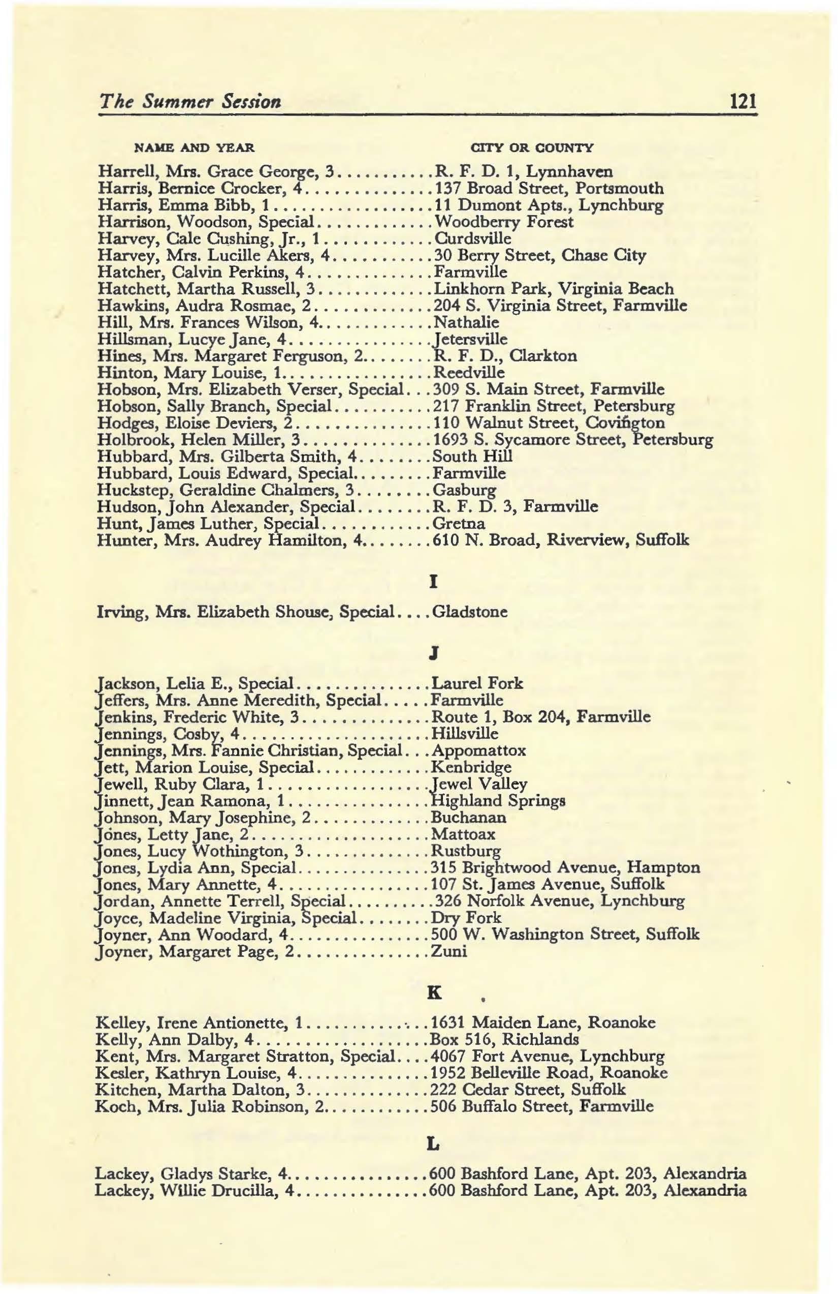 Harrell , Mrs. Grace George, 3 R. F. D 1, Lynnhaven Harris, Bernice Crocker, 4 137 Broad Street, Portsmouth Harris, Emma Bibb, 1 ..... . ....... . . . .. 11 Dumont Apts. , Lynchburg Harrison, Woodson , Special .. . .......... Woodberry Forest Harvey, Cale Cushing, Jr., 1 ... ......... Curdsville Harvey, Mrs. Lucille Akers, 4 . .. ....... . 30 Berry Street, Chase City Hatcher, Calvin Perkins, 4 . ............. Farmville Hatchett, Martha Russell, 3 ............. Linkhom Park, Virginia Beach Hawkins, Audra Rosmae, 2 . ............ 204 S. Virginia Street, Farmville Hill, Mrs. Frances Wilson, 4 . ........... . Nathalie Hillsman, Lucye Jane, 4 . ....... . ....... Jetersville Hines, Mrs. Margaret Ferguson , 2 ........ R . F. D., Clarkton Hinton, Mary Louise, 1. ........ . . . .... . Reedville Hobson, Mrs. Elizabeth Verser, Special . .. 309 S. Main Street, Farmville Hobson, Sally Branch, Special. ...... . ... 217 Franklin Stree t, Petersburg Hodges, Eloise Deviers, 2 . ......... . .... 110 Walnut Street, Covington Holbrook, Helen Miller, 3 .... ..... . .. . . 1693 S. Sycamore Street, Petersburg Hubbard, Mrs. Gilberta Smith, 4 .. .. . . . . South Hill Hubbard, Louis Edward, Special.. .... . .. Farmville Huckstep, Geraldine Chalmers, 3 .. . . •.. . Gasburg Hudson, John Alexander, Special. R. F. D 3, Farmville Hunt, James Luther, Special. . .. . ...... . Gretna Hunter, Mrs. Audrey Hamilton, 4• 610 N. Broad, Riverview, Suffolk