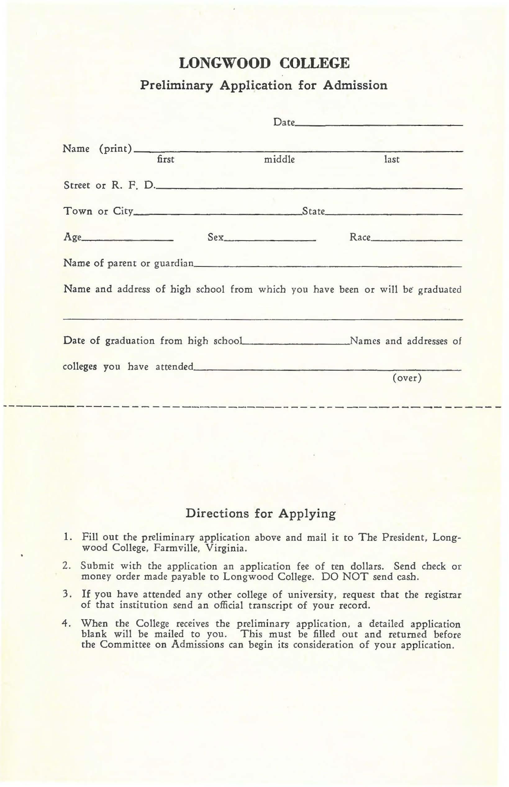 1. Fill out the preliminary application above and mail it to The President, Longwood College, Farmville, Virginia.