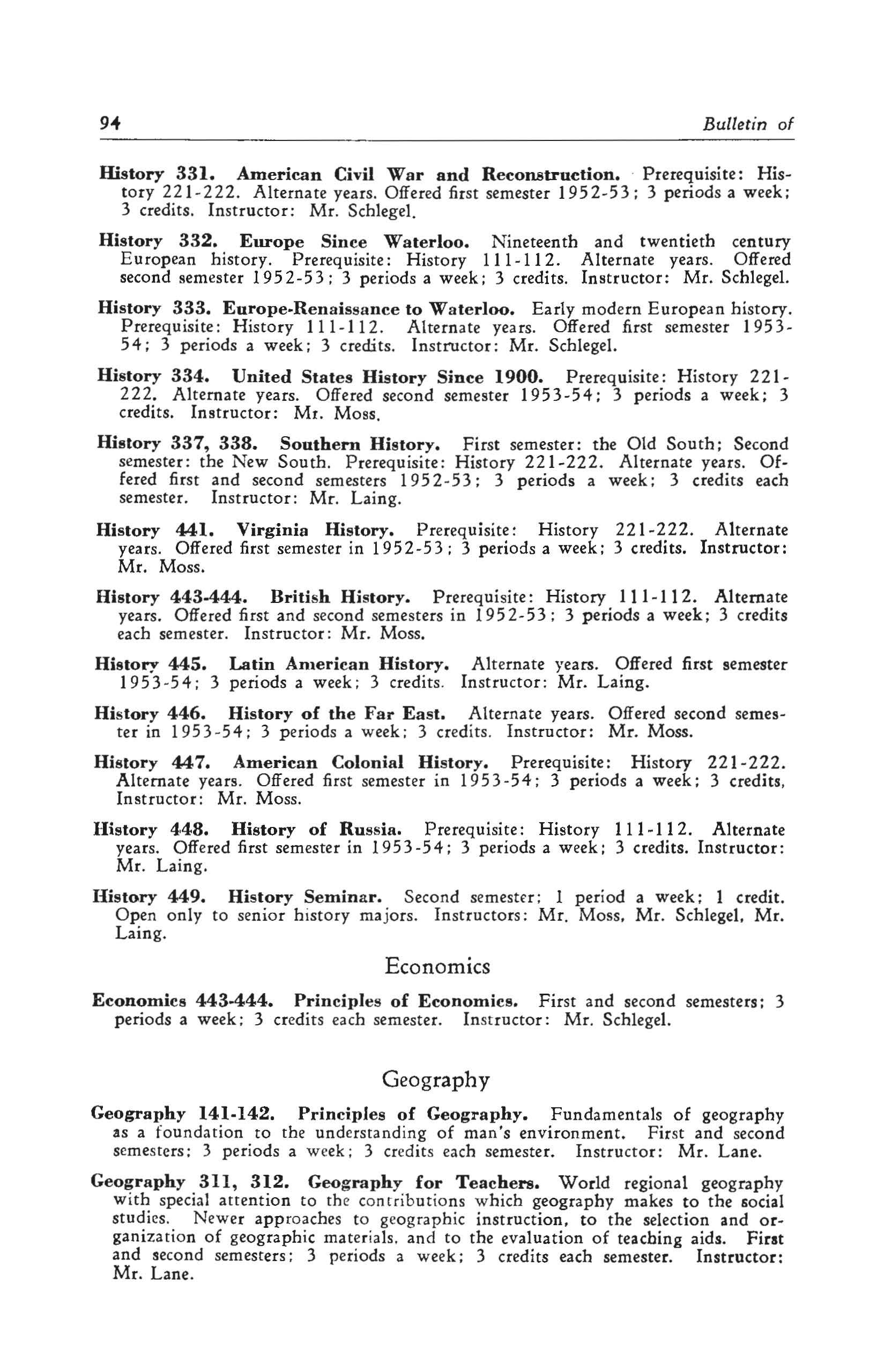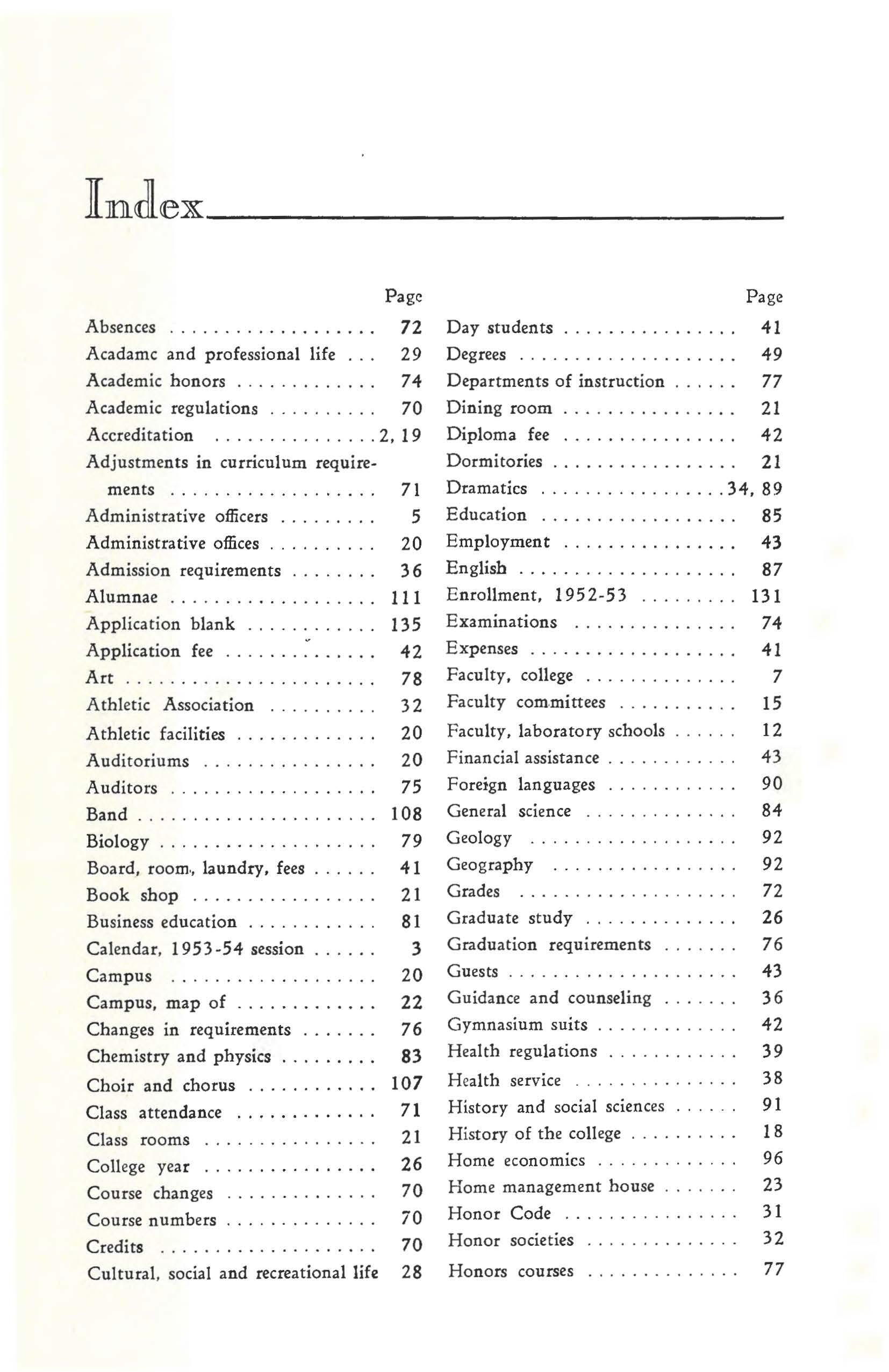 Dining room . . . . . . . . . . . . . . . . 21 Diploma fee 42 Dormitories 21 Dramatics .. ..... ... .... ... 34, 89 Education 85 Employment 43 English 87 Enrollment, 1952-53 .. . ..... . 131 Examinations 74 Expenses . . . . . . . . . . . . . . . . . . . 41 Faculty, college 7 Faculty committees .. ..... . . . . Faculty, laboratory schools .. ... . Financial assistance Foreign languages General science Geology Geography Grades Graduate study Graduation requirements Guests .................... . Guidance and counseling Gymnasium suits ......... . . Heal th regulations