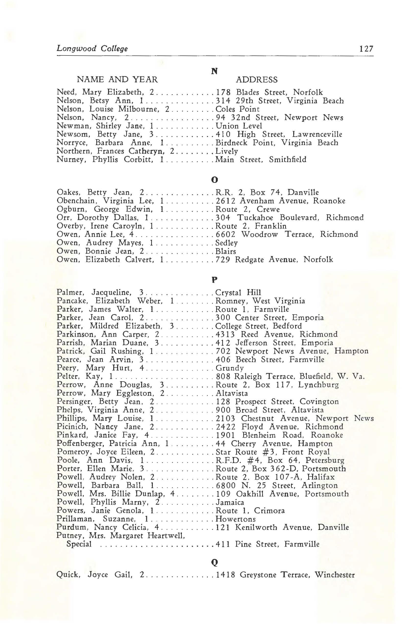 Palmer, Jacqueline, 3 Crystal Hill Pancake, Elizabeth Weber, 1 . . . Romney, West Virginia Parker, James Walter, 1 Route 1 , Farmville Parker, Jean Carol. 2. 300 Center Street, Emporia Parker, Mildred Elizabeth , 3. . .. College Street, Bedford Parkinson, Ann Carper, 2 4 313 Reed Avenue, Richmond Parrish, Marian Duane, 3 ... ... . ... . 412 Jefferson Street, Emporia Patrick , Gail Rushing, 1 702 Newport News Avenu e, Hampton Pearce, Jean Arvin, 3 . . ... . . . . . .. . 406 Beech Street , Farmville Peery, Mary Hurt, 4 Grundy Pelter, Kay, 1. 808 Raleigh Terrace, Bluefield , W. Va. Perrow, Anne Douglas, 3. . . ... Route 2, Box 117 , Lynchbur g Perrow , Mary Eggleston, 2. . .. Altavista Persinger, Betty Jean , 2. 128 Prospect Street , Covington Ph elps , Virginia Anne, 2 900 Broad Street, Altavista Phillips, Mary Loui se, 1 . . .... 2103 Ch es tnut Avenue , Newport News Picinich, Nancy Jane, 2. 2422 Floyd Avenue , Richmond Pinkard, Janice Fay, 4 1901 Blenheim Road, Roanok e Poffenberger, Patricia Ann, 1 44 Cherry Avenue, Hampton Pomeroy, Joyce Eileen, 2... . .. Star Route #3 , Front Royal Poole, Ann Davis. 1 R.F.D. #4, Box 64, Petersburg Porter , Ellen Marie , 3 Route 2, Box 362-D, Portsmouth Powell , Audrey Nolen, 2 . . .. Route 2. Box 10 7-A, Halifax Powell, Barbara Ball, 1. 6800 N. 25 Street, Arlin g ton Powell, Mrs. Billie Dunlap, 4. . . . 109 Oakhill Avenue, Portsmouth Powell, Phyllis Marny, 2 Jamaica Powers, Janie Genola, 1 . . .. Route 1, Crimora Prillaman, Suzanne, 1 Howertons Purdum, Nancy Celicia , 4. 121 Kenilworth Avenue, Danville Putney, Mrs. Margaret Heartwell, Special ................... 411 Pine Street , Farmville