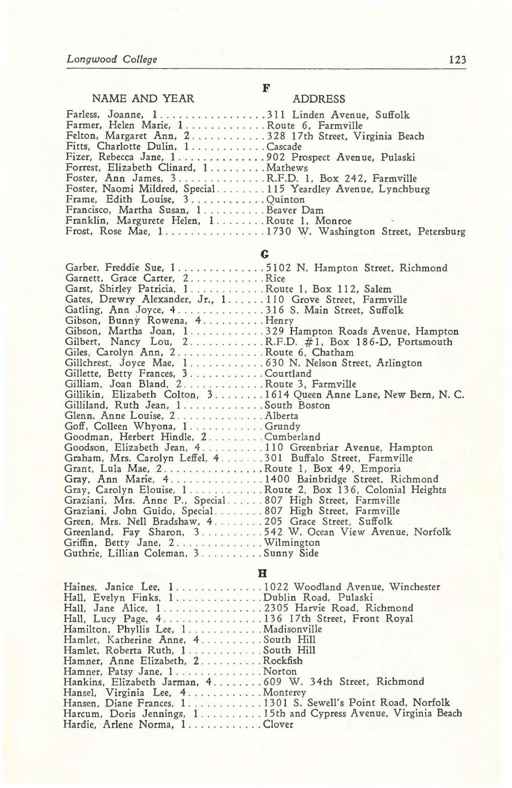 Garber, Freddie Sue, I 5102 N Hamp t on Street, Richmond Garnett , Grace Carter , 2 ..... . ..... . Rice Garst , Shirley Patricia , I ............ Route I , Box 112, Salem Gates, Drewry Alexander , Jr. , 1 . ..... '110 Grove Stre et , Farmville Gatling, Ann Joyce, 4 .............. 316 S. Main Street, Suffolk Gibson, Bunny Rowena, 4 H enr y Gibson, Martha Joan, I 329 Hampton Roads Avenue, Hampton Gilbert, Nancy Lou , 2 R .F. D # 1, Box 18 6-D. Portsmouth Giles , Carolyn Ann , 2 .......... . ... Route 6 , Chatham Gilkhr est Joyce Mae , 1 630 N N elson Street, Arlington Gillette, Betty Frances. 3 ............ Courtland Gilliam, Joan Bland , 2 Route 3, Farmville Gillikin, Elizabeth Colton , 3 1614 Queen Anne Lane, New Bern, N. C. Gilliland. Ruth Jean, 1 South Boston Glenn. Anne Louise. 2 A lb erta Goff , Colleen Whyo n a, I . . . . . . . . .. Grund y Goodman , Herbert Hindle , 2 Cumb erla nd Goodson , Elizabeth Jean, 4 .......... 110 Greenbriar Avenue, Hampton Graham, Mrs. Carolyn Leffel. 4 301 Buffalo Street, Farmville Grant, Lula Mae, 2 . .. ...... ..... . . Route 1 , Box 49 , Emporia Gray, Ann Marie , 4 1400 Bainbridge Street, Richmond Gray, Carol y n Elouise , I ....... . .... Route 2 , Box 136 , Colonial Heights Graziani , Mrs . Anne P ., Sp ec ial ...... 807 High Street, Farm v ille Grazian i , John Guido , Spec ial .. .. .... 807 High Street, Farmville Green , Mrs. Nell Bradshaw , 4 ........ 205 Grace Street , Suffolk Greenland, Fay Sharon, 3 542 W. Oc ean V iew Avenue , Norfolk Griffin, Bett y Jane, 2 Wilmington Guthrie , Lill ian Coleman, 3 Sunny Side