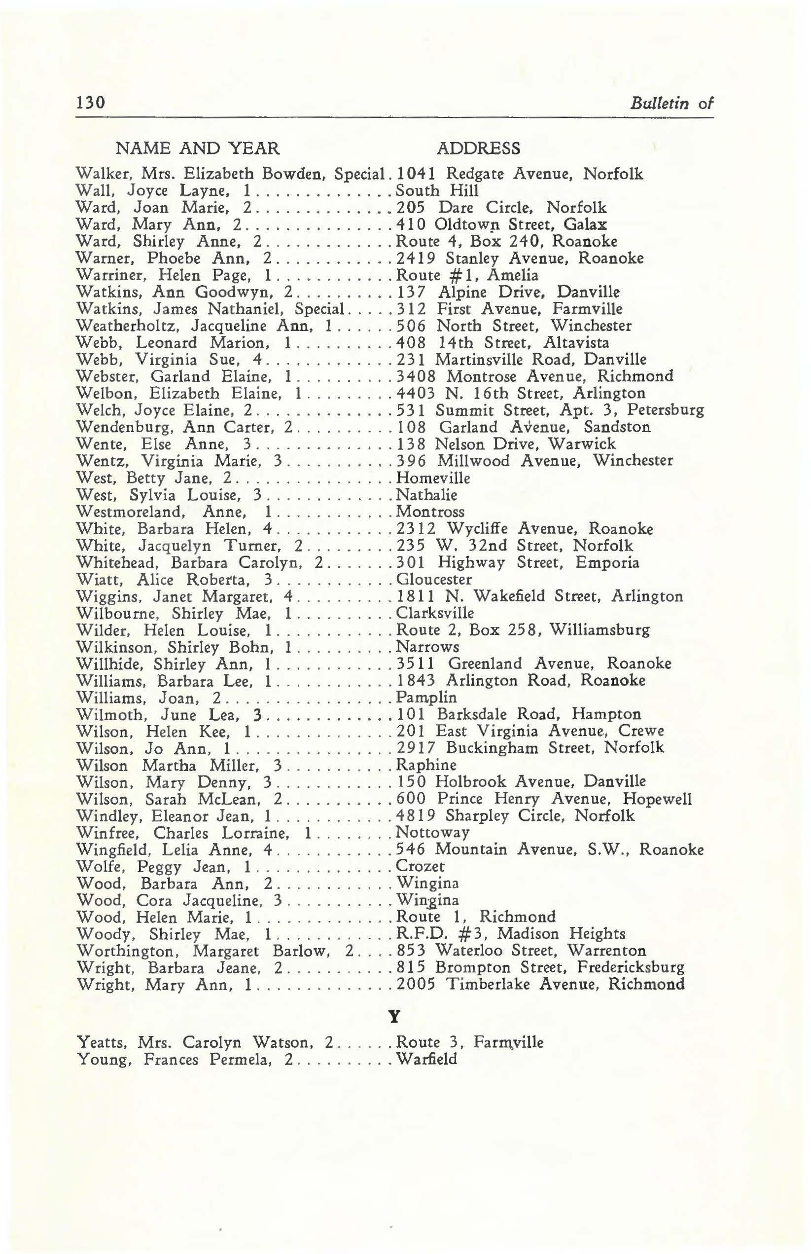 Walker, Mrs. Elizabeth Bowden, Special. 1041 Redgate Avenue, Norfolk Wall, Joyce Layne, 1 .... ... .... ... South Hill Ward, Joan Marie, 2 205 Dare Circle, Norfolk Ward, Mary Ann, 2 ............... 410 O!dtoWJl Street, Galax Ward, Shirley Anne, 2 Route 4, Box 240, Roanoke Warner, Phoebe Ann, 2 ............ 2419 Stanley Avenue, Roanoke Warriner, Helen Page, 1 .......... .. Route # 1, Amelia Watkins, Ann Goodwyn, 2 13 7 Alpine Drive, Danville Watkins, James Nathaniel, Special. 312 First Avenue, Farmville Weatherholtz, Jacqueline Ann. I 506 North Street, Winchester Webb, Leonard Marion, l ... .... ... 408 14th Street, Altavista Webb, Virginia Sue, 4 231 Martinsville Road, Danville Webster, Garland Elaine, 1 .......... 3408 Montrose Avenue, Richmond Welbon, Elizabeth Elaine, l 4403 N. 16th Street, Arlington Welch, Joyce Elaine, 2 ...... .. ..... . 531 Summit Street, Apt. 3, Petersburg Wendenburg, Ann Carter , 2 108 Garland Avenue, Sandston Wente, Else Anne, 3 13 8 Nelson Drive, Warwick Wentz, Virginia Marie, 3 396 Millwood Avenue, Winchester West, Betty Jane, 2 ................ Homeville West, Sylvia Louise, 3 Nathalie Westmoreland, Anne, l ............ Montross White, Barbara Helen, 4 2312 Wycliffe Avenue, Roanoke White, Jacquelyn Turner, 2 ......... 235 W. 32nd Street, Norfolk Whitehead, Barbara Carolyn , 2 3 0 I Highway Street, Emporia Wiatt, Alice Roberta, 3 ............ Gloucester Wiggins, Janet Margaret, 4 1811 N. Wakefield Street, Arlington Wilbourne , Shirley Mae, l .......... Clarksville Wilder, Helen Louise, l Route 2, Box 258, Williamsburg Wilkinson , Shirley Bohn, l Narrows Willhide, Shirley Ann, l ............ 3511 Greenland Avenue, Roanoke Williams, Barbara Lee, l ... ... .... . . I 84 3 Arlington Road , Roanoke Williams, Joan, 2 Pamplin \Vilmoth, June Lea, 3 l Ol Barksdale Road , Hampton Wilson, Helen Kee, l .... ... ....... 20 I East Virginia Avenue, Crew e Wilson, Jo Ann, l 2917 Buckingham Street, Norfolk Wilson Martha Miller, 3 Raphine Wilson, Mary Denny, 3 150 Holbrook Avenue, Danville Wilson, Sarah McLean, 2 ..... ..... . 600 Prince Henry Avenue, Hopewell Windley, Eleanor Jean, l , 4 819 Sharpley Circle, Norfolk Winfree, Charles Lorraine, I .. ...... Nottoway Wingfield , Lelia Anne, 4 546 Mountain Avenue, S.W., Roanoke Wolfe, Pe ggy Jean, l ........... ... Crozet Wood, Barbara Ann, 2 , Wingina Wood, Cora Jacqueline , 3 ........... Win:g,ina Wood, Helen Marie, l Route I, Richmond Woody, Shirley Mae, l R.F.D. #3, Madison Heights Worthington, Margaret Barlow, 2 .... 853 Waterloo Street, Warrenton Wright , Barbara Jeane, 2 815 Brompton Street, Fredericksburg Wright, Mary Ann, 1 .............. 2005 Timberlake Avenue, Richmond