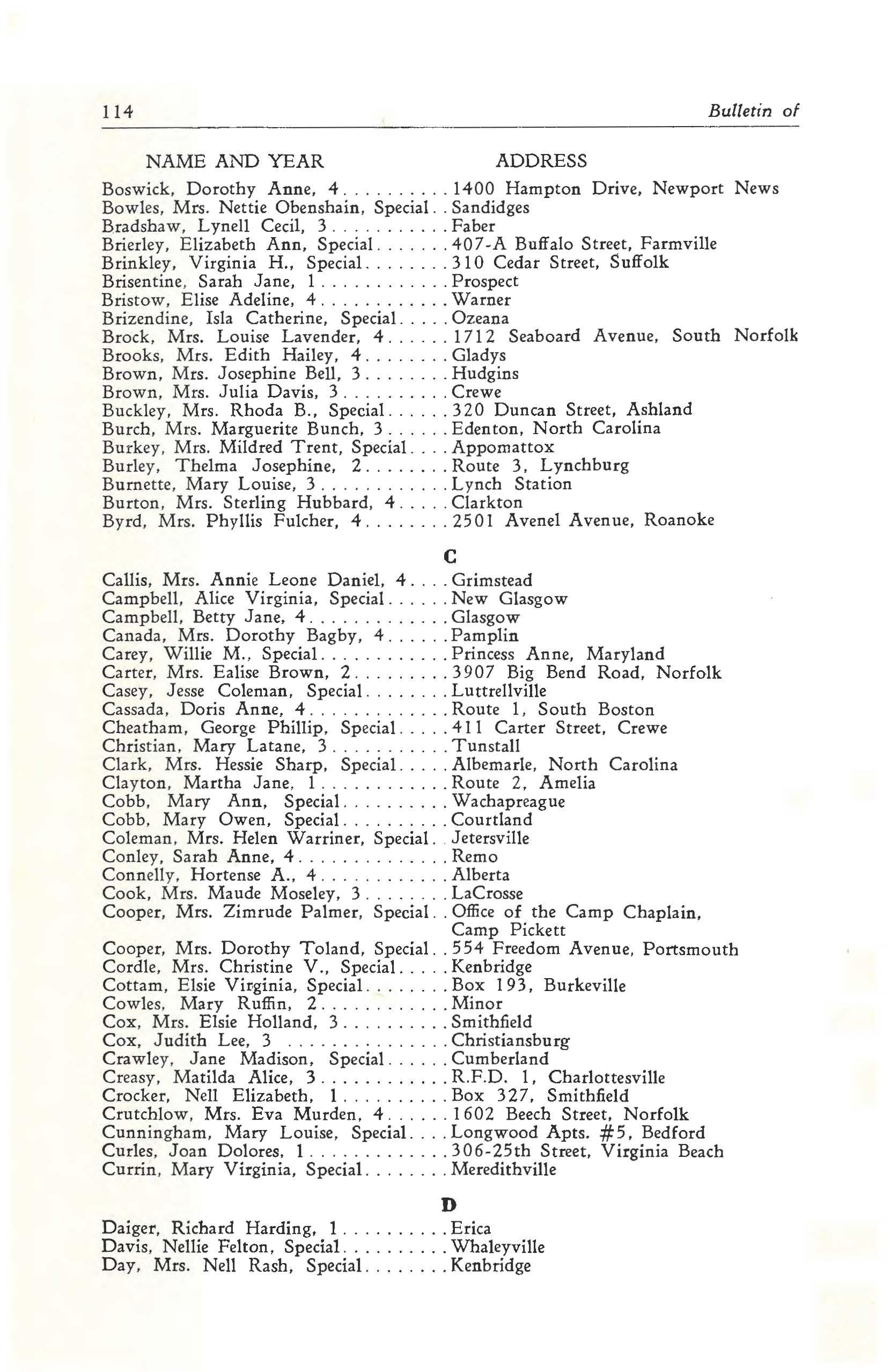 Bradshaw, Sylvia Paige, 2 ....... .. . Newsoms Branch, Beverly Jane, 3 844 St. Lawrence Ave., Norfolk Brandt, Jewel Faye, 1 Amelia Brisentine, Sarah Jane, I Prospect Brooking, Anne Field, 1 Montpelier Station Brooking, Loretta Bell, I Creighton Rd., Richmond Brooks, Edith Davis, Special ...... .. . 203 St. George St., Farmville Brothers, Christine Everett, 4 I 05 Cedar Court , Suffolk Brothers, Louise Vandalia, 1. . .. 105 Cedar Court , Suffolk Brown , Hilda Bradford, 1 Raphine Brown, Mrs . Julia Davis, 4 . ......... Crewe Brown, Nancy Elaine, 2 205 Lee Street, Front Royal Brown, Patricia Anne, 1 Guinea Mills Bruce, Mrs Thelma Price, 1 . 408 Beech St., Farmville Buq:ess , Diana, 1 I 5612 Lake Ave., Lakewood, Ohio Burg ess, Virginia Ann, 2 ............ Eagle Rock Burley, Thelma Josephine, 2 Route 3, Lynchburg Burnette, Mary Louise, 2 .......... .. Lynch Station Button, Mary Rogers, 2 •. Gordonsville