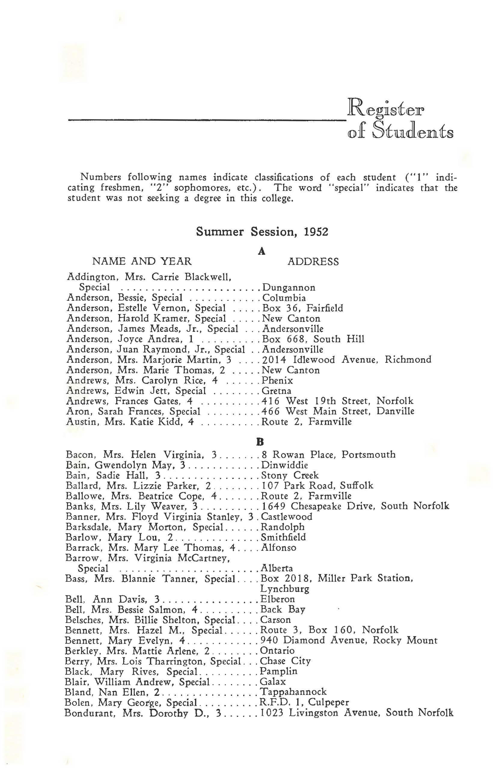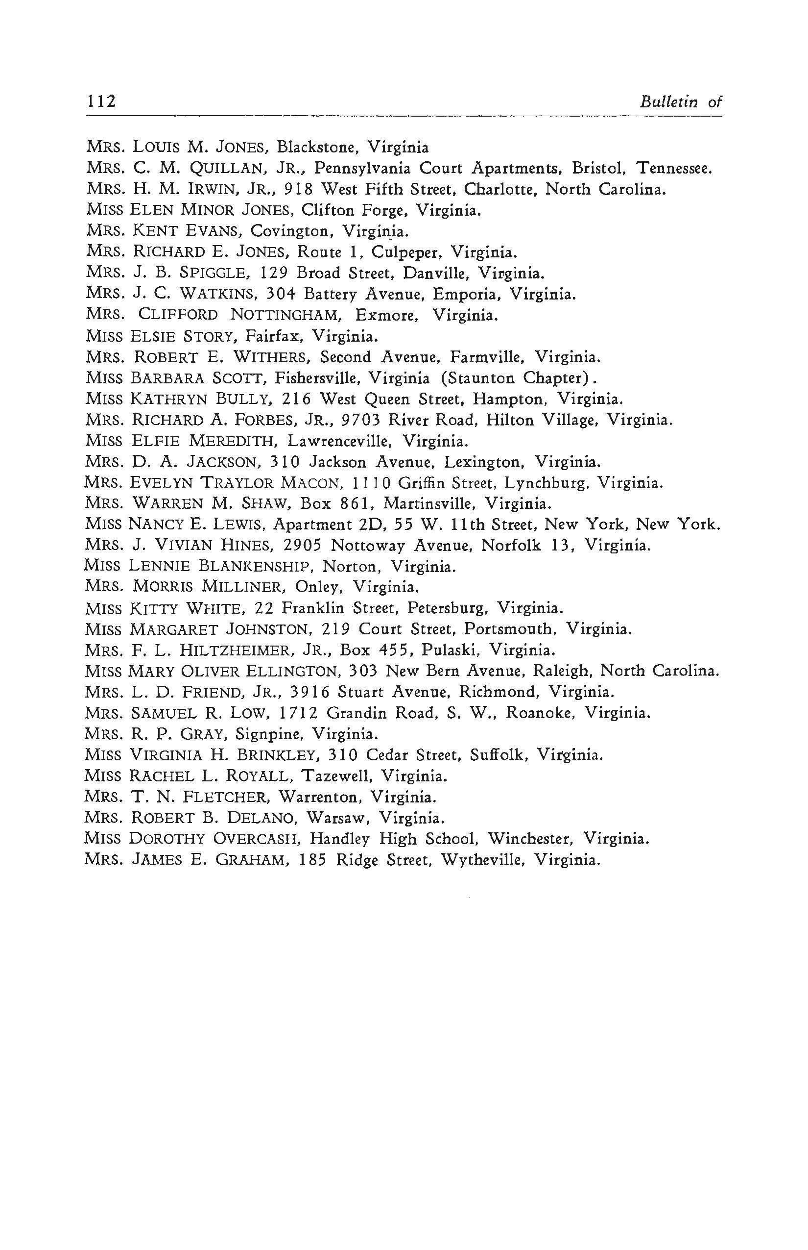 Baber, Jean Carole, 3 .. .... .. ... ... Crozet Bailey, Martha Jane, 2 ... . .. .. ...... 24 Westside Court, Lexington Bailey, Mrs. Mary Huzek, 1 .. ... . . ... 2607 Cool Lane, Richmond Bain, Gwendolyn May, 4 Dinwiddie Baird, Rebecca, 3 107 Appomattox St., Farmville Baldwin, Dorothy Mae, 2 ........... 134 Westmoreland Court, Danville Barksdale, Mrs. Mary Bennett, 3 Red House Barlow, Mary Lou, 2 .............. Smithfield Barnes, Dorothy Ann, I Route 1, Kenbridge Barr, Betty Cynthia, 2 .............. Amelia Barrow, Margaret Helen, 4 711 Brunswick Ave., Blackstone Bartenstein, Linda Garber , 2 ........ Warrenton Bauder, Stephanie Ann, 1 19 Great Hills Ter., Short Hills, N. J. Beavers, Lura Alice, 3 ............. Indian Bell, Ann Davis, 4 Elberon Benn, Hazel Virginia, l Rt. 15, Box 355, Richmond Bennett, Mary Evelyn, 4 ... ... ...... 940 Diamond Ave., Rocky Mount Bentley, Elizabeth Leigh, 2 Ellerson Benton, Betty Vincent, 3 .. .. . .. .... . 308 Bosley Ave., Suffolk Berry, Alice Virginia, 3 Skipwith Berry, Betsy Anne, 1 ..... .. .. .. ... Madison Biddlecomb, Johanna May, 3 Fair Port Birdsall, Nancy Carolyn, 2 Route l, Petersburg Bishop, Celeste Wise, 4 .... . ...... . . 491 Avondale Drive, Danville Blackman, Barbara Ann, 3 5 28 Greenway Dr., Portsmouth Blair, Rebecca Ann, 1 Route 5, Danville Blake, Emily Jane, 1 310 48th Street, Virginia Beach Blake , Florence Rabon, 2 ....... . ... . 310 48th Street, Virginia Beach Bland, Nan Ellen, 3 Wakefield Bodkin, Patricia, 2 ....... . .. .. . ... Route 1, Gretna Booker, Barbara Anne, 4 Belona Booth , Mary Ellen, 2 208 Mistletoe Drive, Warwick Borum, Clara Ellen, 3 Burkeville Boswell , Elizabeth McKewn, 3 South Hill Boswell, Muriel Olive, 1 ............ Midway Island Bowlin, Evelyn Caroline, 1 Mattoax Boyd, Barbara Wilson, 2 ............ 217 N. Main St .. Blackstone