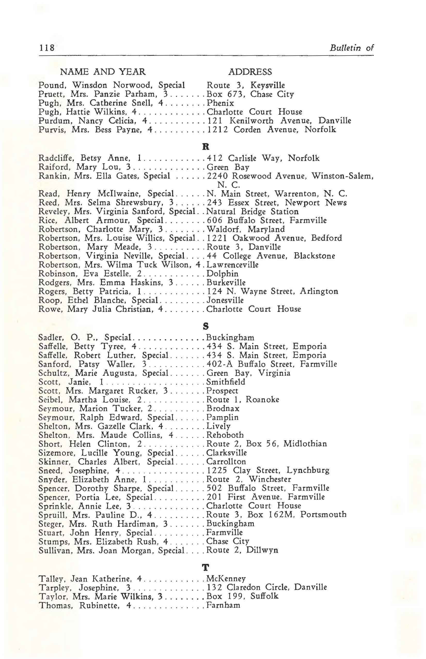 Radcliffe , Betsy Anne, 1 . ... . .. . . . . . 412 Carlisle Way, Norfolk Ream es, Sylvia Lynn, 3 . . .... .... . . 835 High Street, Petersburg R eed, Naomi Virginia, 2 ........... . Salisbury, Vermont Richardson, Evelyn Joyce, 4 . . ...... Howertons Ri chey, Julia Muriel. 1 .. . . .... ... . 6015 N. 9th Road, Arlington Ri ckman , Barbara Young, 2 3 09 Pine Street, Farmville Ril ey , Norma Elore, 2 . . ... ..... . 2 09 Hollywood Avenue, Hampton R o berts, Shirley Ann, 1 600 West Main Street , Christiansburg Roberts , Suzanne, 1 . . . . . . . . . . . . 1116 Hampton Avenue, Newport News Robertson , Betsy Jean, 3 1600 Early Street , Lynchburg Robertson , Charlotte Mary, 4 .... .. .. R . F.D. #2 , Waldorf , Maryland Robertson, Mary Meade, 3 Route #3 , Danville R o binson, Eric Lloyd, 3 Route # 1 , Farmville Robins on , Mary Elva, 3 Norton R o by, Shirley Grey, 3 ... . . . ...... . . Frederick Street, Staunton Rocha , Shirley Ruth, 1 ... ..... .... . 16 West Colin Drive , Portsmouth Rog ers , Betty Patricia, 1 ....... . ... . 124 N. Wayne Street , Arlington Ruffin , Marion Bruce, 1 Route 1, Tunstall Russell , Rheta Davidson, 1 ... . .. .. . . Virginia Avenue, Clarksville Rutland , Frances Lawana , 2 P 0 Box 242, Scottsville