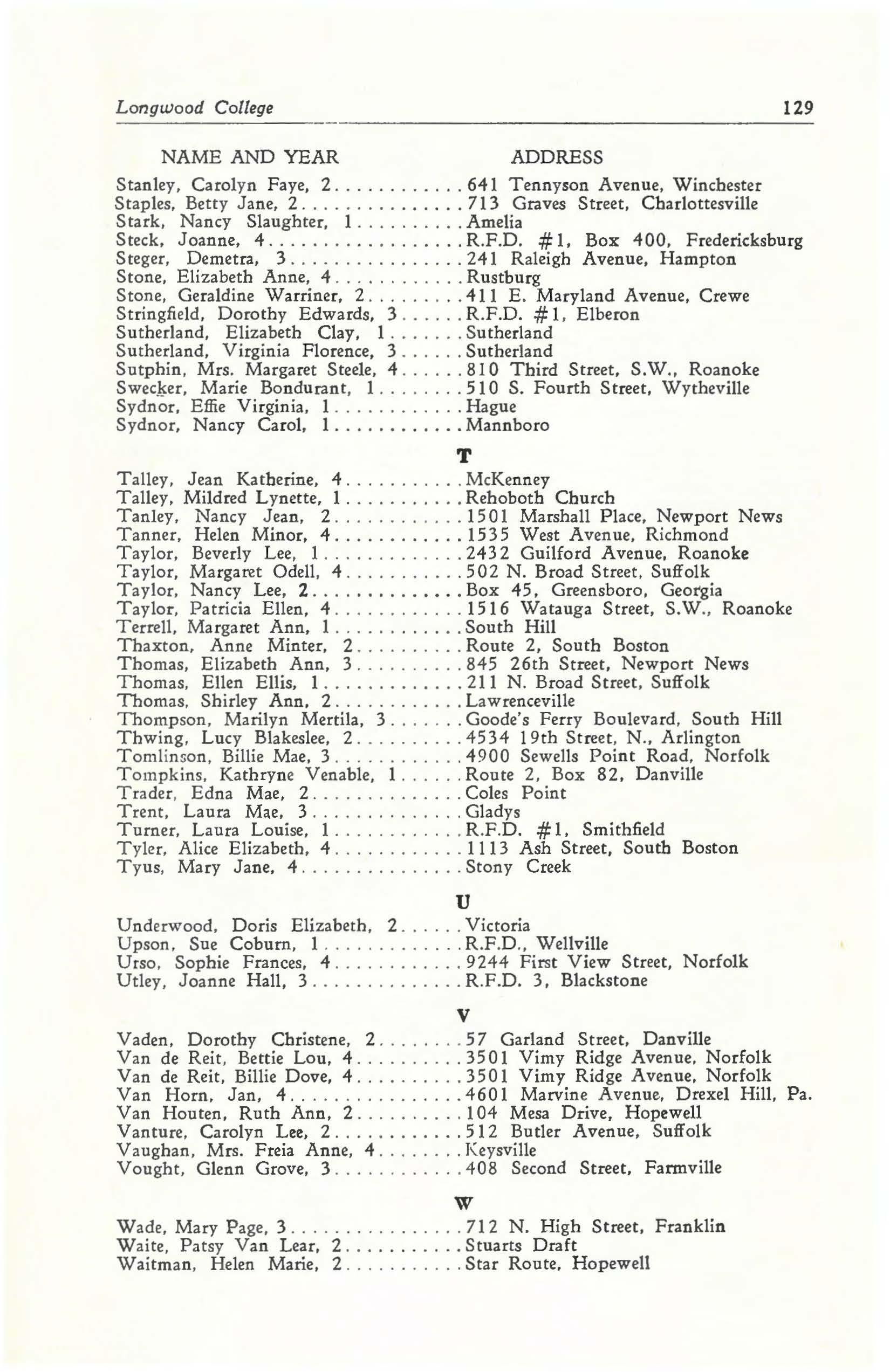 Stanley, Carol yn Faye, 2 641 Tennyson Avenue , Winchester Staples, Betty Jane, 2 ... .... . . . . ... . 713 Graves Street, Charlottesville Stark, Nancy Slaughter, 1 Amelia Steck , Joanne, 4 R.F.D. # l. Box 400, Fredericksburg Steger, Demetra, 3 .. . ..... .. .. .... 241 Raleigh Avenue, Hampton Stone, Elizabeth Anne , 4 Rustburg Stone, Geraldine Warriner , 2 411 E. Maryland Avenue, Crewe Stringfield, Dorothy Edwards, 3 R F.D. # 1, Elberon Sutherland, Elizabeth Clay, l Sutherland Sutherland, Virginia Florence, 3 Sutherland Sutphin, Mrs. Margaret Steele, 4 . .... . 810 Third Street, S.W., Roanoke Swee.ls.er , Marie Bondurant, l 510 S. Fourth Street, Wytheville Sydnor, Effie Virginia. l . ........ .. . Hague S ydn or, Nancy Carol, 1 , Mannboro