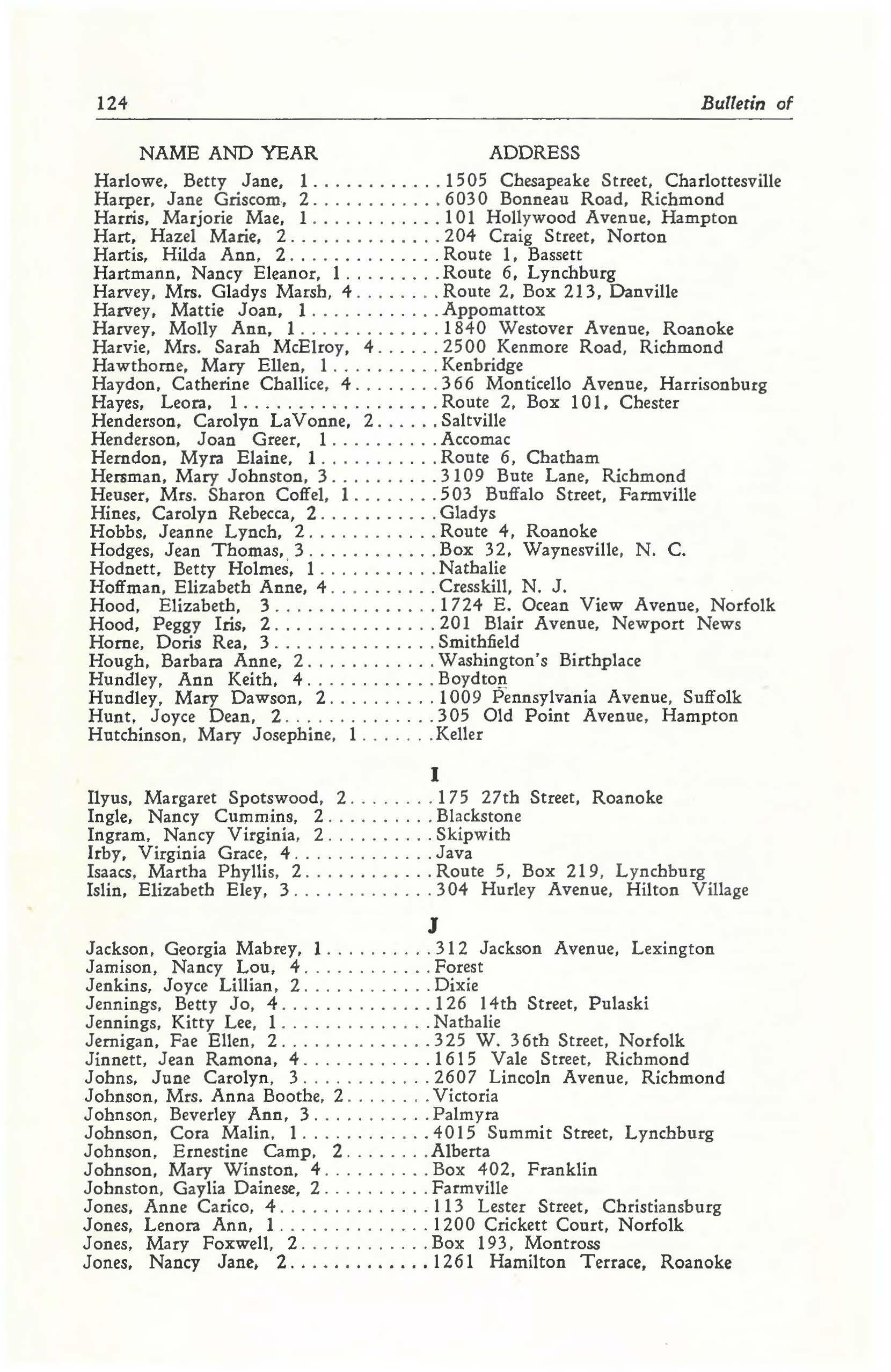 Harlowe, Bett y Jane, 1 . ........... 1505 Chesapeake Street , Charlottes v ille Harper , Jane G risco m, 2 6030 Bonneau Ro ad , Richmond Harris, Marjorie Mae, 1 .... ..... . .. 101 Holl y wood Avenue , Hampton Hart, Hazel Marie, 2 204 Craig Stre et, Norton Hartis, Hilda Ann , 2 ...... . . ...... Rout e 1 , Bassett Hartmann, Nancy Eleanor , 1 Route 6, Lynchburg Harvey, Mrs . Gladys Marsh , 4 ...... . . Route 2, Box 213, Danville Harvey, Mattie Joan, 1 Appomatto x Harvey, Moll y Ann, 1 ............. 1 8 40 Westover Avenue , Roanoke Harvie, Mrs. Sarah McE!roy, 4 2500 Kenmore Road , Richmond Hawthorne , Mary Ellen , 1 Kenbridge Haydon, Catherine Challic e, 4 366 Monticello Avenue, Harrisonburg Hayes, Leora , 1 . .. . . . . .. . . ..... . . Route 2 , Box 101. Chester Henderson , Carolyn La V onne, 2 Saltville Henderson , Joan Greer, 1 ..... . .... Accomac Herndon, Myra Elaine, 1 . .. . ...... . Route 6 , Chatham Hersm an, Mary Johnston , 3 .......... 3109 Bute Lane, Ri chmond Heuser, Mrs. Sharon Coff el , 1 503 Buffalo Street, Farmville Hines, Carolyn Rebecca, 2 ....... . ... Gladys Hobbs, Jeanne Lynch, 2 Route 4 , Roanoke Hodges , Jean Thomas, 3 Box 32, Waynesvill e, N. C. Hodnett, Betty Holmes, 1 Nathalie Hoffman, Elizabeth Anne, 4 Cresskill, N. J. Hood , Elizabeth , 3 ............... 1724 E. Ocean View Avenue , Norfolk Hood, Peggy Iris, 2 ......... . ..... 201 Blair Avenue, Newport News Home, Doris Rea, 3 .... . .... .. .. . . Smithfield Hough, Barbara Anne, 2 Washington's Birthplace Hundley, Ann Keith, 4 . ........... Boydtog Hundley, Mary Dawson, 2 100 9 Pennsylvania Avenue , Suffolk Hunt, Joyce Dean, 2 ........ ...... 305 Old Point Avenu e, Hampton Hutchinson , Mary Josephin e, 1 Keller