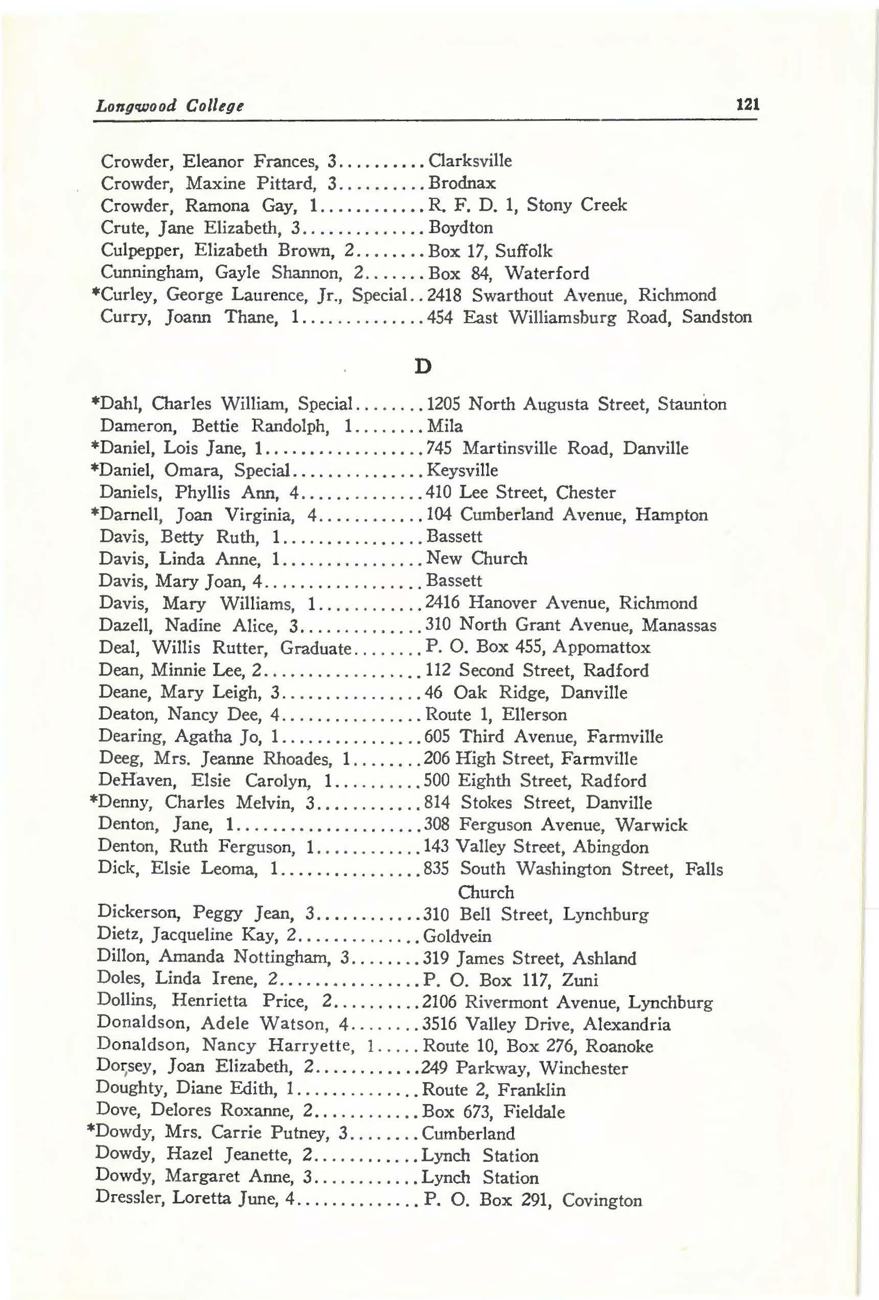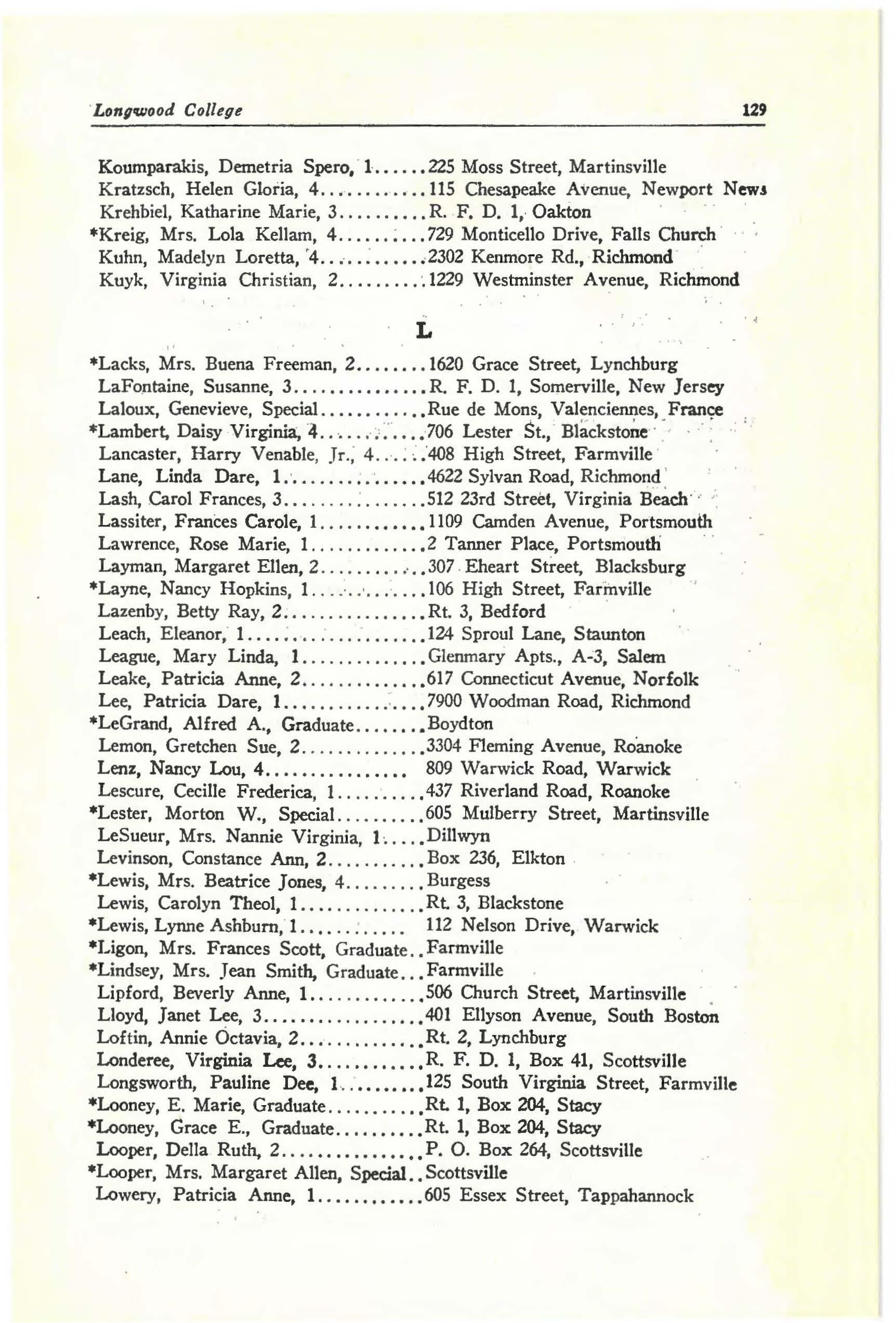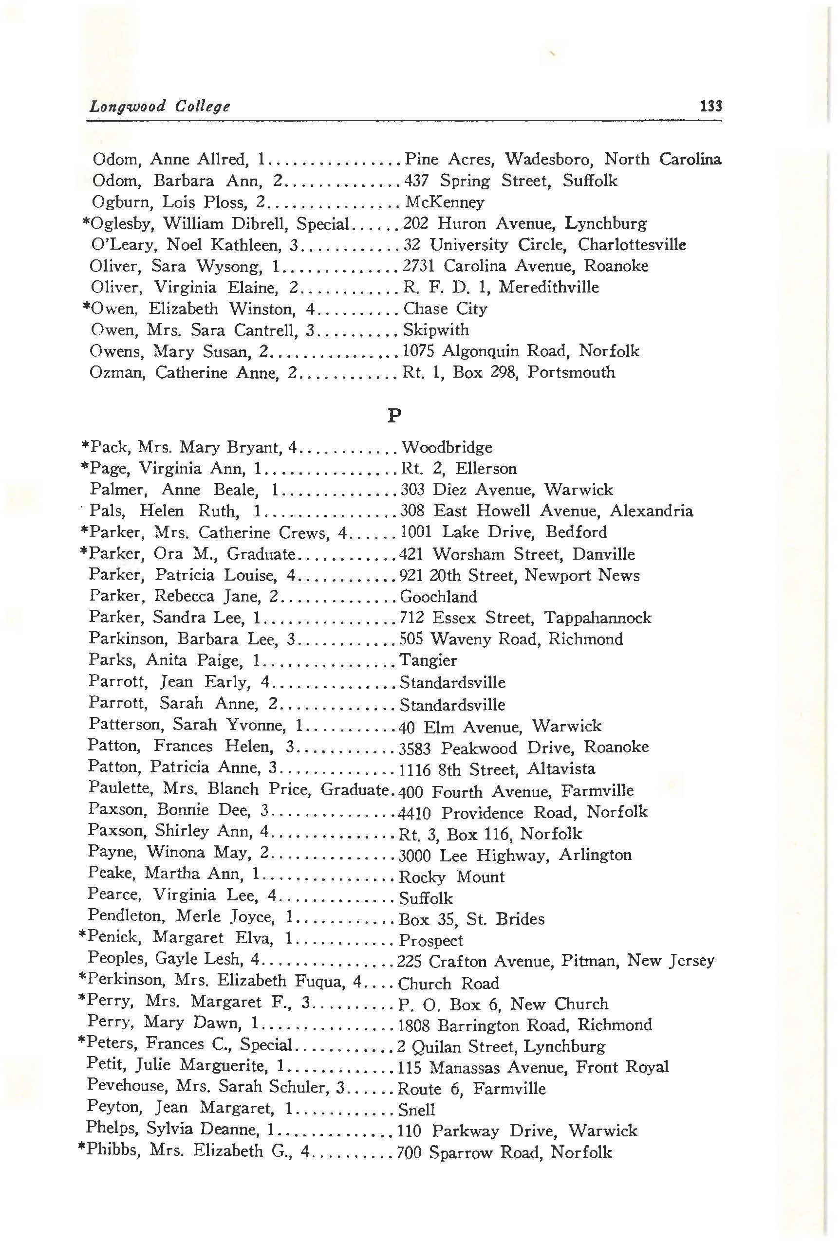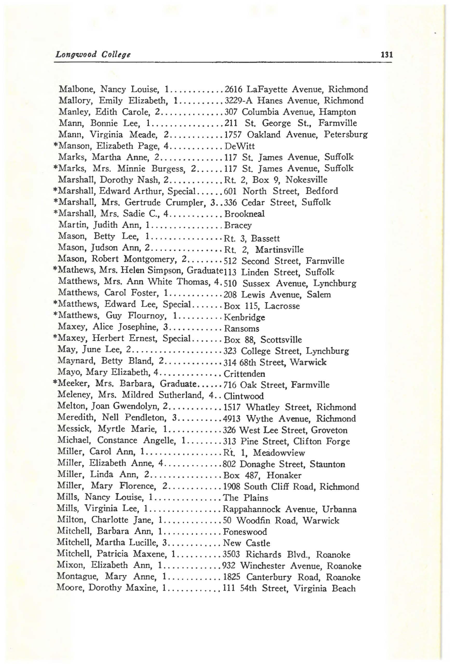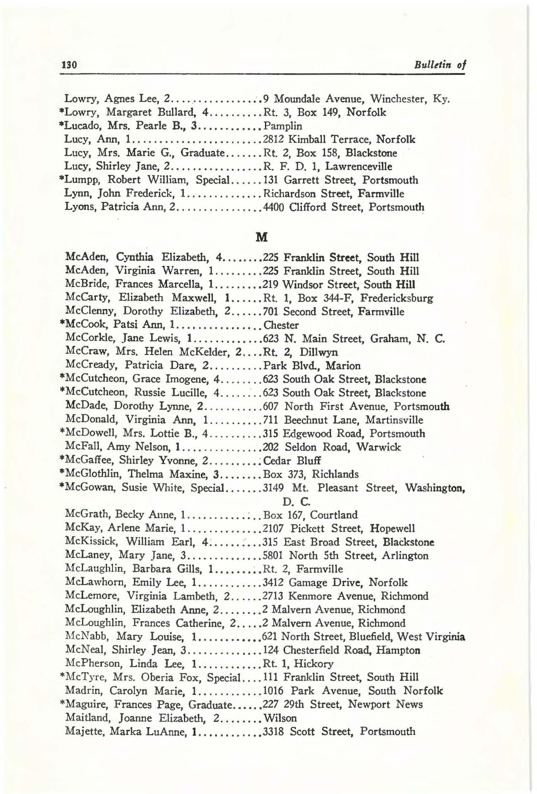 *Wood, John Earl, Graduate Pamplin Woodhouse, Ann Tucker, 4 15 West Princeton Circle, L y nchburg Wootton, Lucy Lee, 3 Econville Workman, Molly Frances, 2 .. ........ 1415 Leigh Street, Norfolk