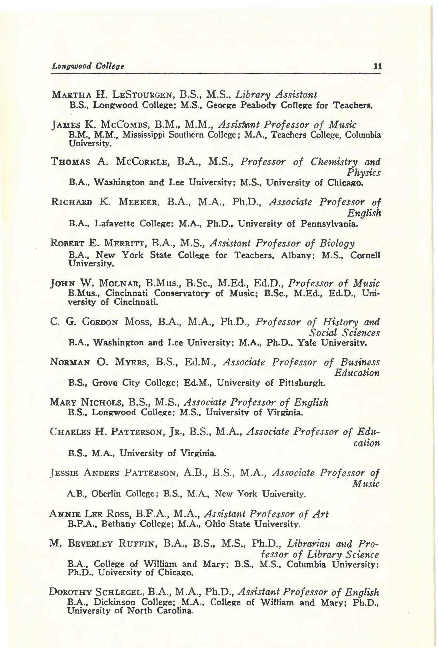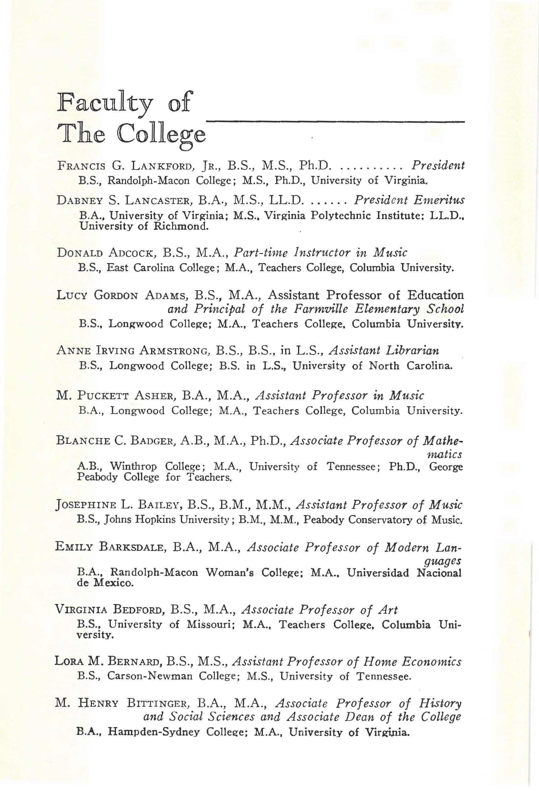Lucy GORDON ADAMS, B.S., M.A., Assistant Professor of Education and Principal of the Farmville Elementary School B.S., Longwood College; M.A., Teachers College, Columbia University.