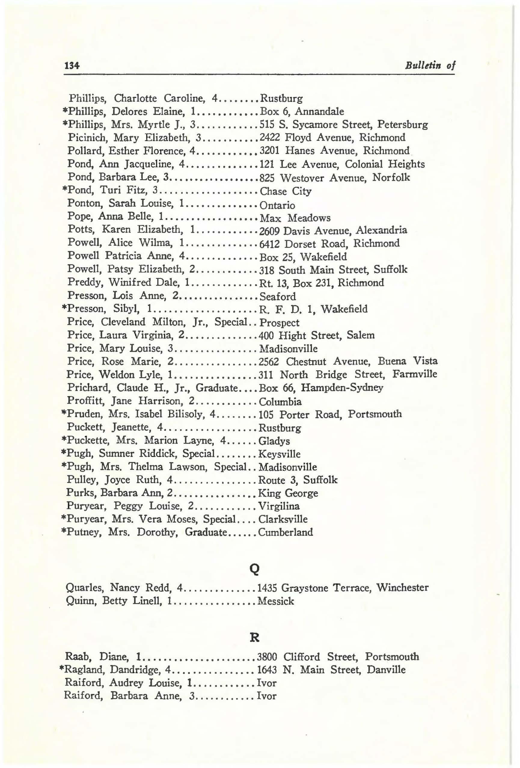 *Worsham, Anne Bruce, 1 865 Main Street, Danville Wright, S ylvia Hope, 4 . .. . .. . ..... . . 1318 Augusta Avenue, Portsmouth Wynne, Elva Jane, 2 • 212 River Road, Matoaca y