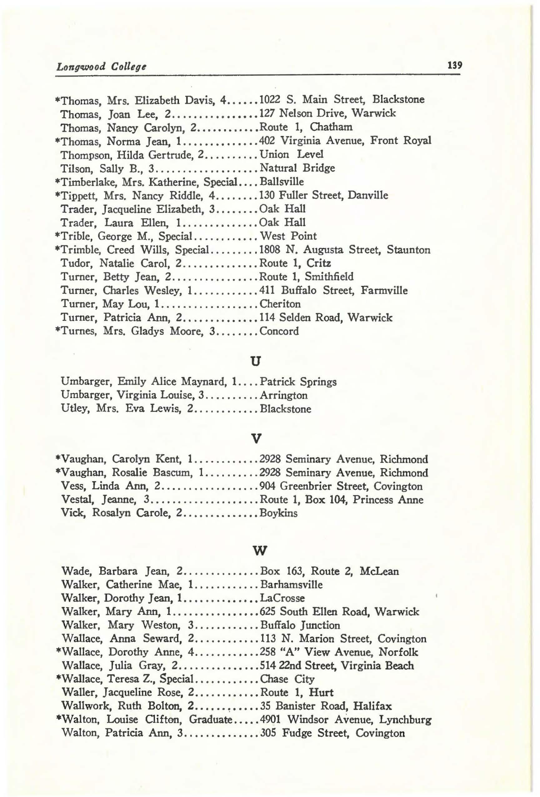 *Wilson, Violetta Sprigg, Special 1808 Wickham Ave , Newport News Winfree, Nancy Boyd, 1 121 Dover Circle, Norfolk Winn, Marjorie Marie, 3 Rt. 2, Danville Wise, Carol Jean, 1 201 Palen Avenue, Warwick