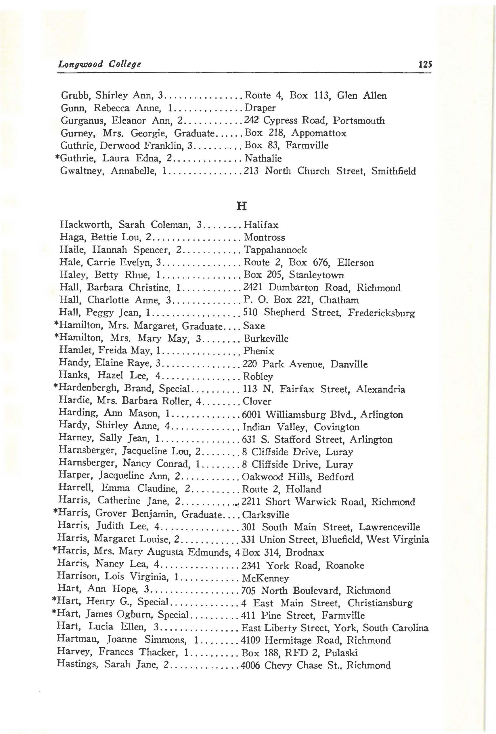 *Yeatman, Julian Howard, Jr. , Special. .. 400 First Avenue, Farmville Yeatts, Mrs. Carolyn Watson, Graduate.A Street, Farmville Young, Anne Lee, 1 R. F D. 3, Box 111, Franklin Young, Helen Jean, 2 315 West Riverside, Covin g ton Young, Mrs. Nina Goad, 4 500 High Street, Farmville Younger, Mary Carter, 2 ... ..... ..... Box 158, Blacksburg z
