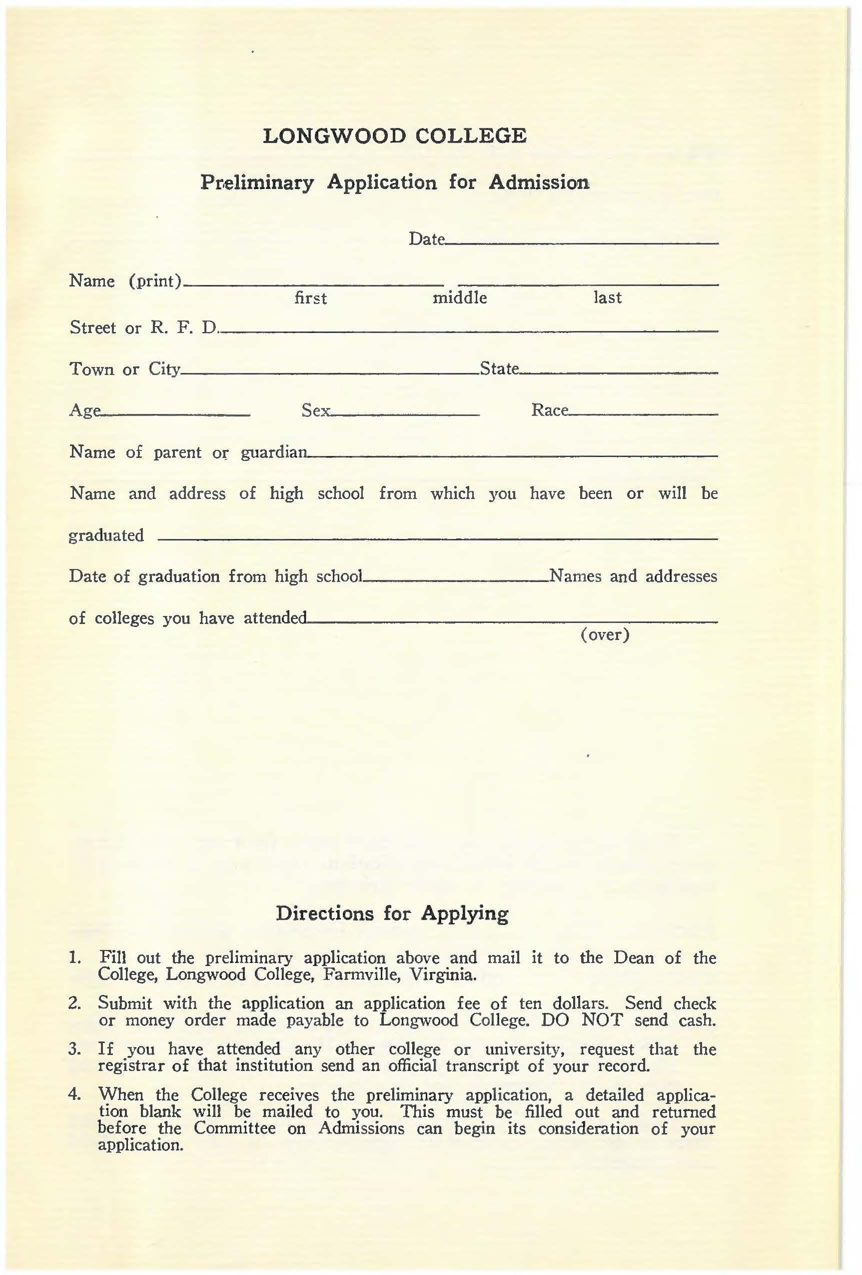 1. Fill out the preliminary application above and mail it to the Dean of the College, Longwood College, Farmville, Virginia.
