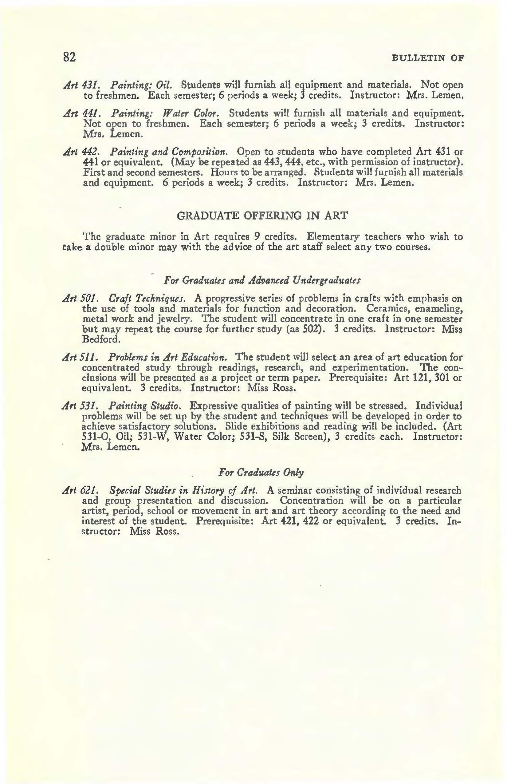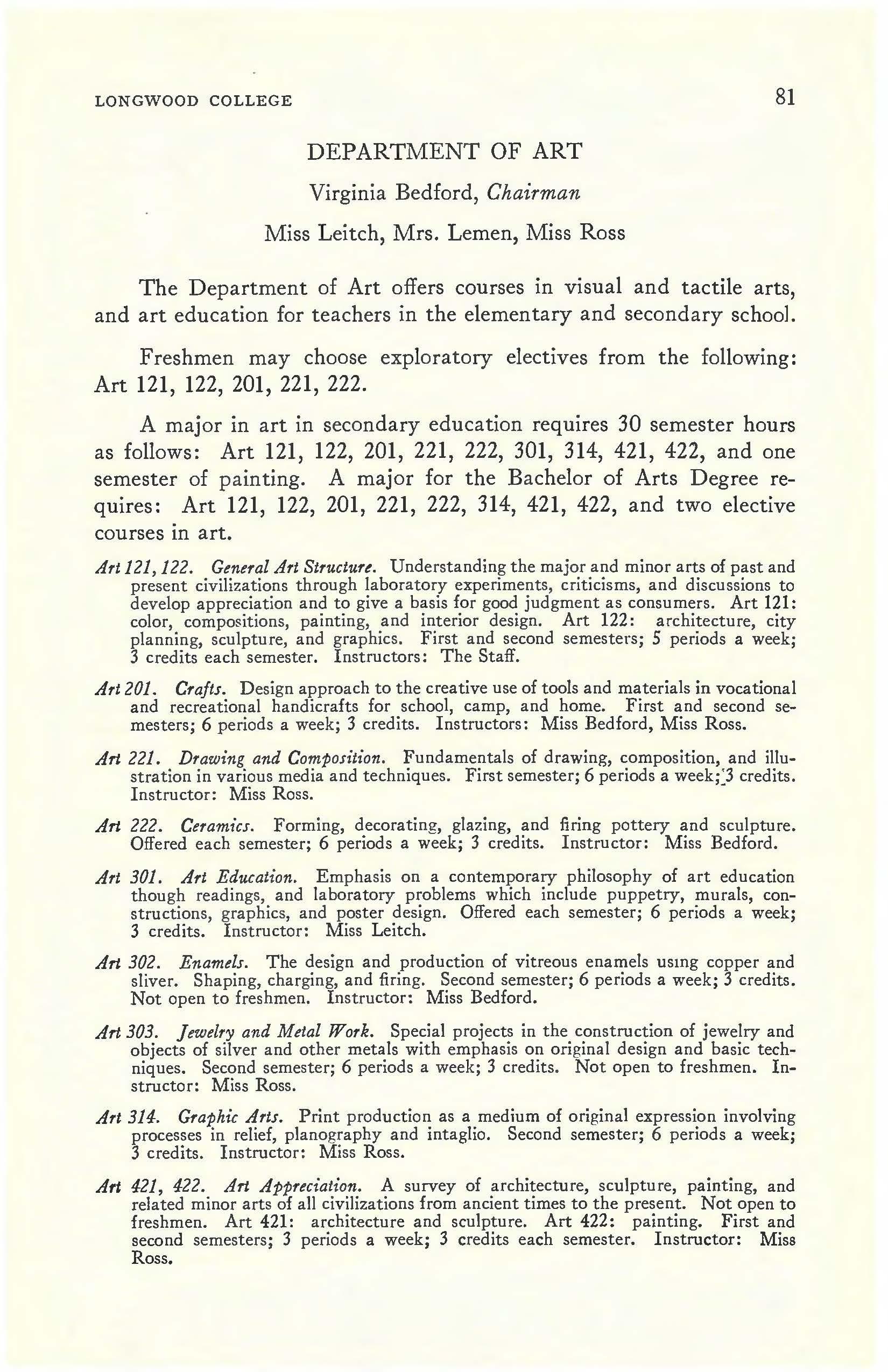 VIRGINIA BEDFORD, B.S., M.A .............. Associate Professor of Art B.S., University of Missouri; M.A., Teachers College, Columbia University.