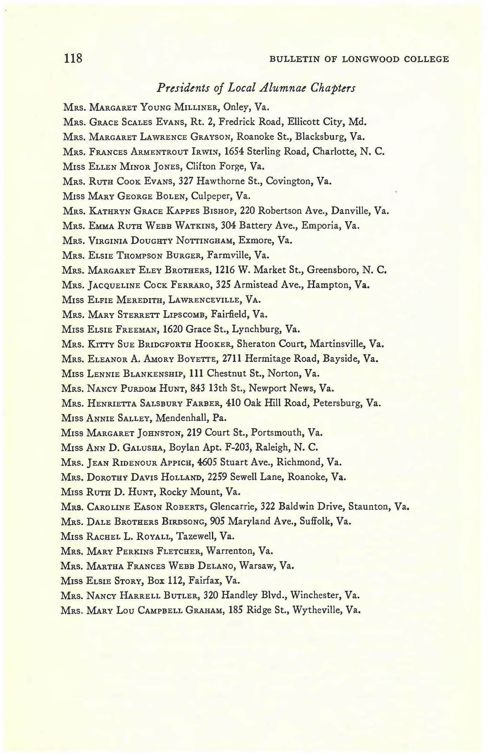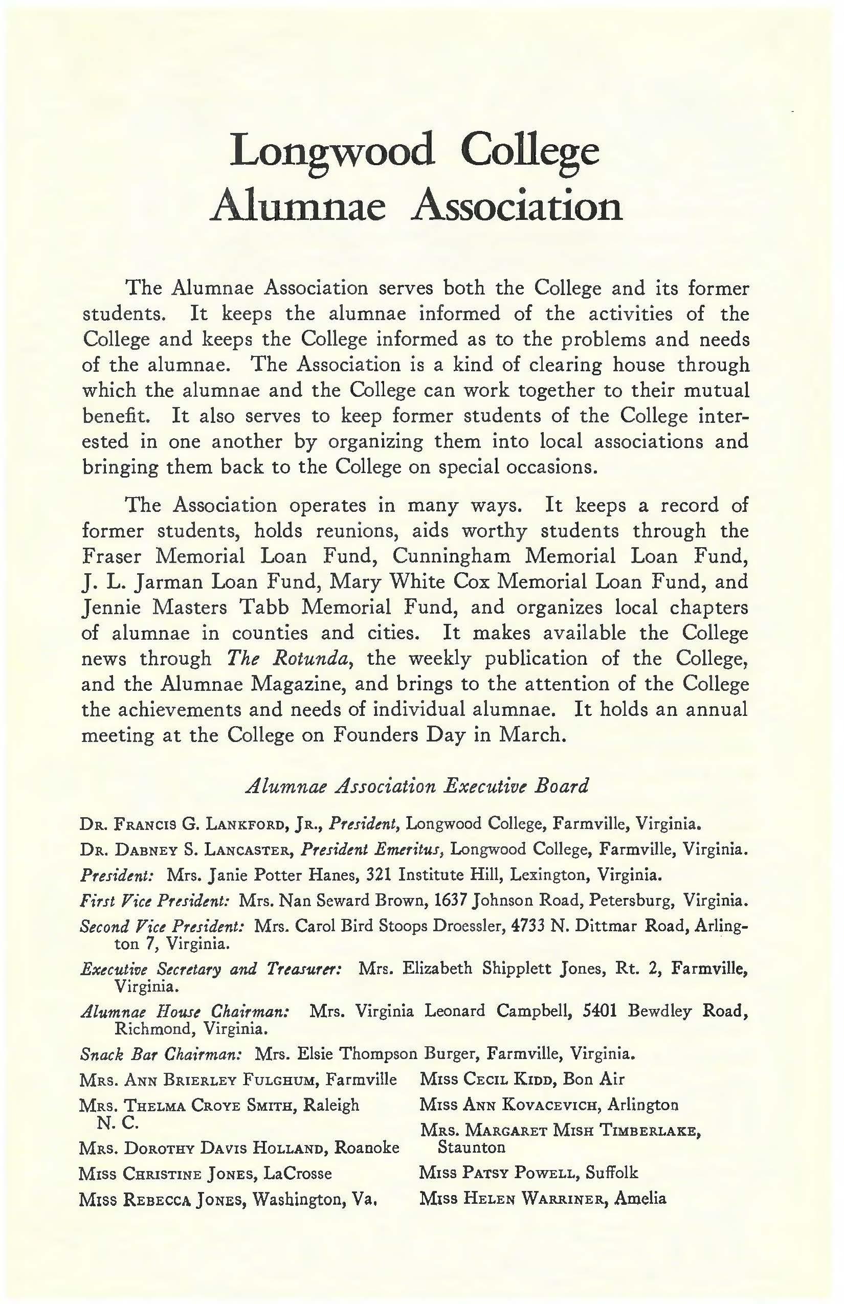 DR. FRANCIS G. LANKFORD, JR., President, Longwood College, Farmville, Virginia, DR. DABNEY S. LANCASTER, President Emeritus, Longwood College, Farmville, Virginia. President: Mrs. Janie Potter Hanes, 321 Institute Hill, Lexington, Virginia.