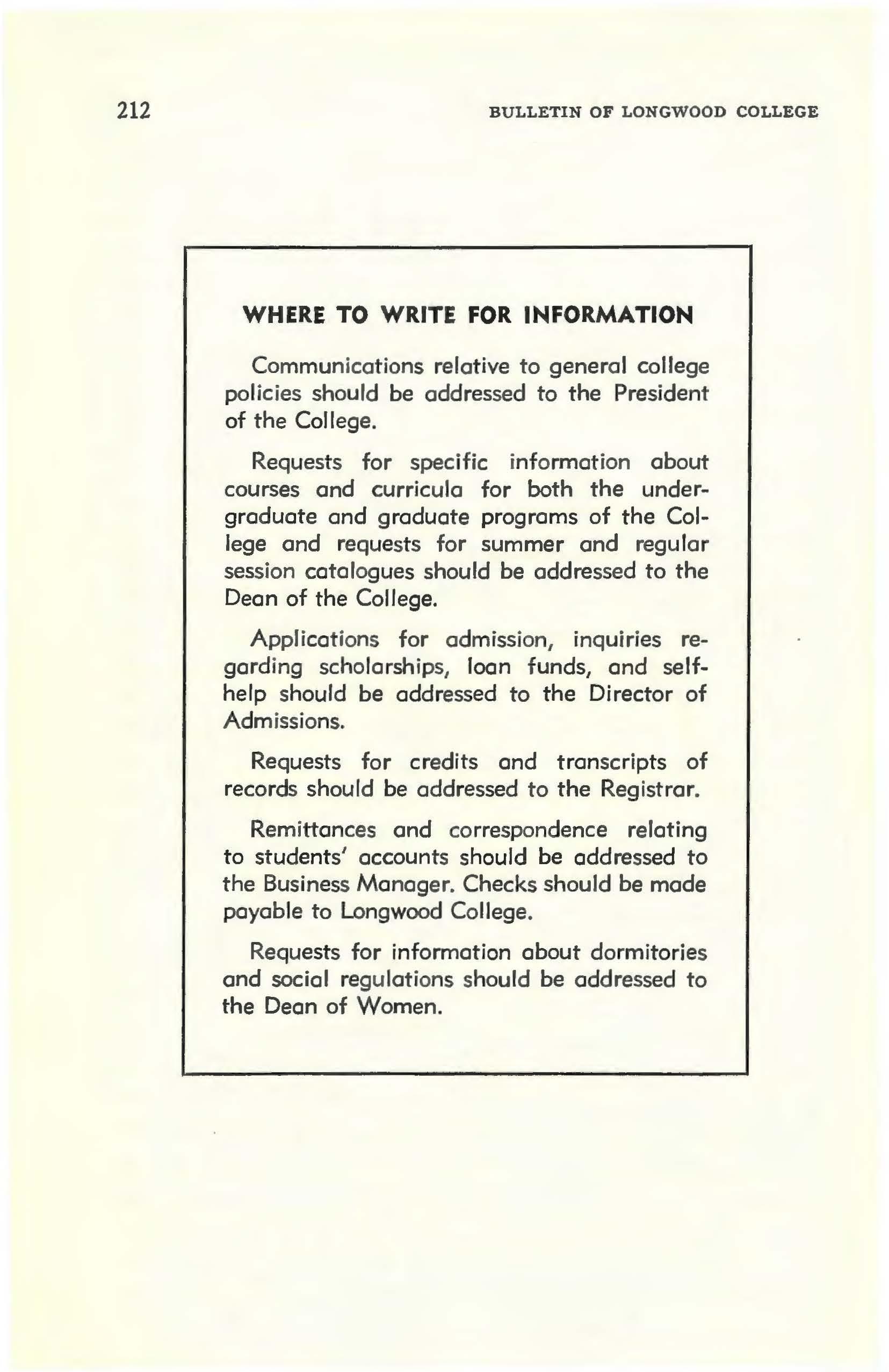 Remittances and correspondence relating to students' accounts should be addressed to the Business Manager. Checks should be made payable to Longwood College.