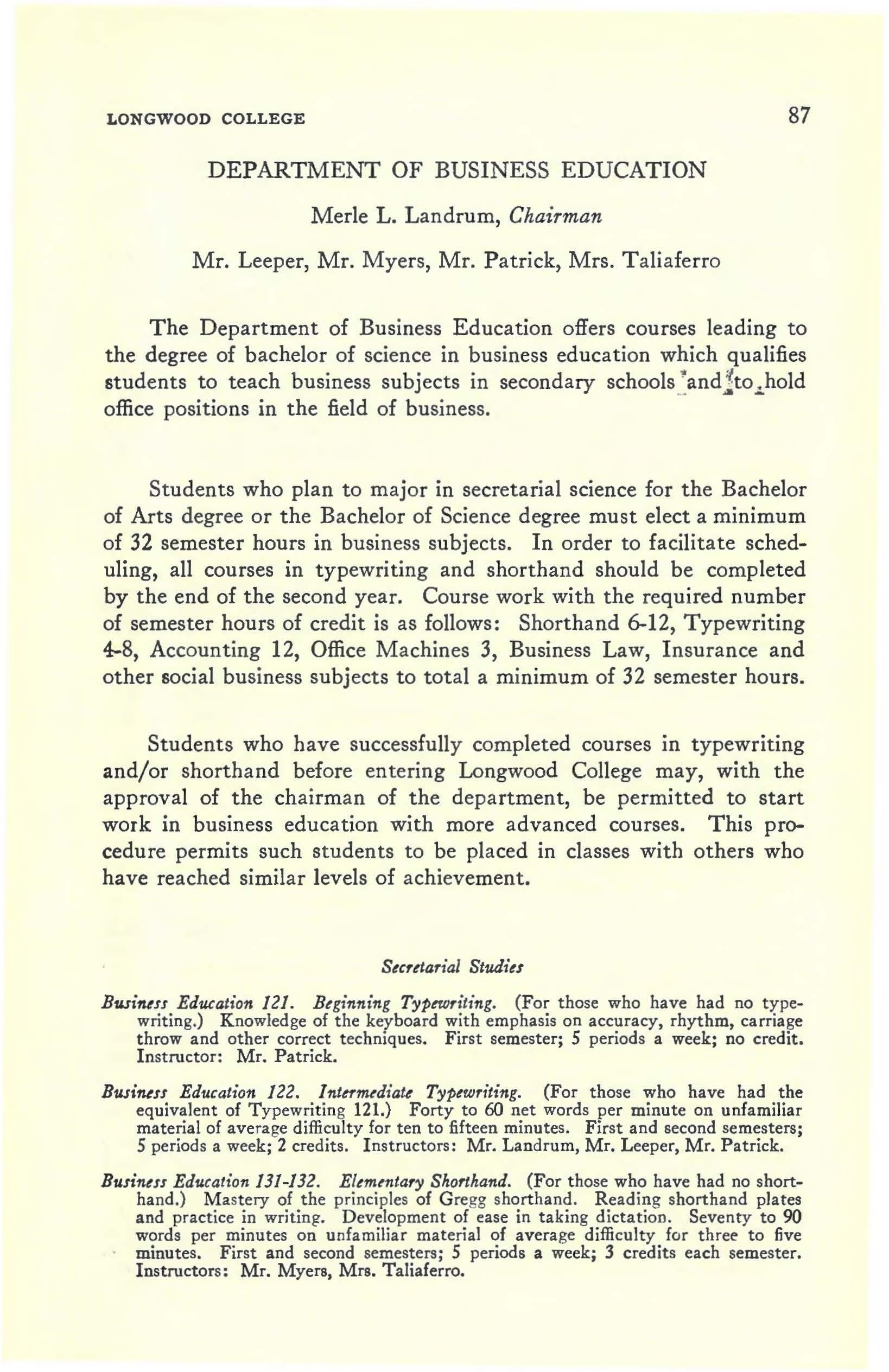 Students who have successfully completed courses in typewriting and/or shorthand before entering Longwood College may, with the approval of the chairman of the department, be permitted to start work in business education with more advanced courses. This procedure permits such students to be placed in classes with others who have reached similar levels of achievement.
