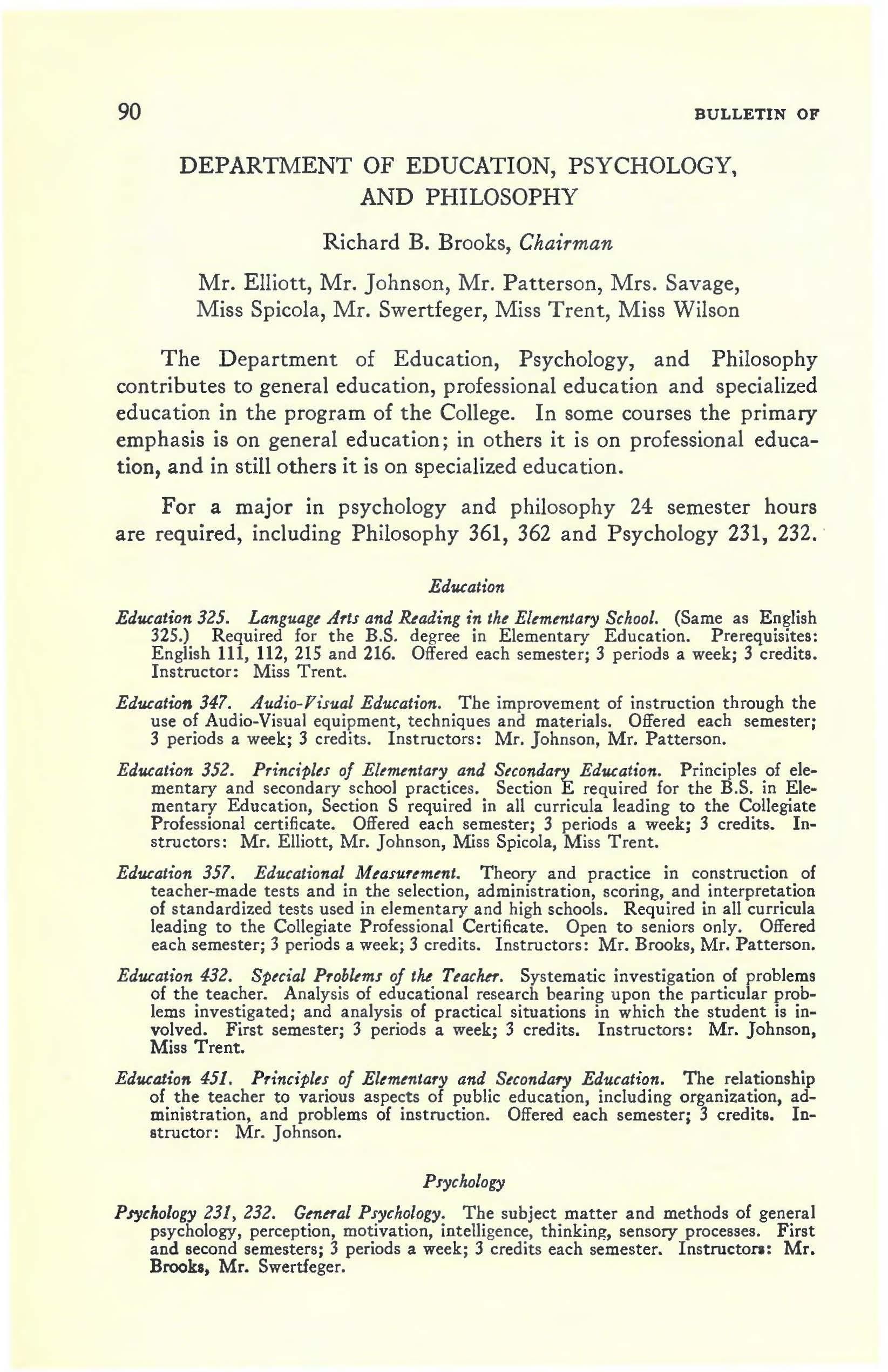 Education 347. Audio-l'isual Education. The improvement of instruction through the use of Audio-Visual equipment, techniques and materials. Offered each semester; 3 periods a week; 3 credits. Instructors: Mr. Johnson, Mr. Patterson. Education 352. Principles of Elementary and Stcondary Education. Principles of elementary and secondary school practices. Section E required for the B.S. in Elementary Education, Section S required in all curricula leading to the Collegiate