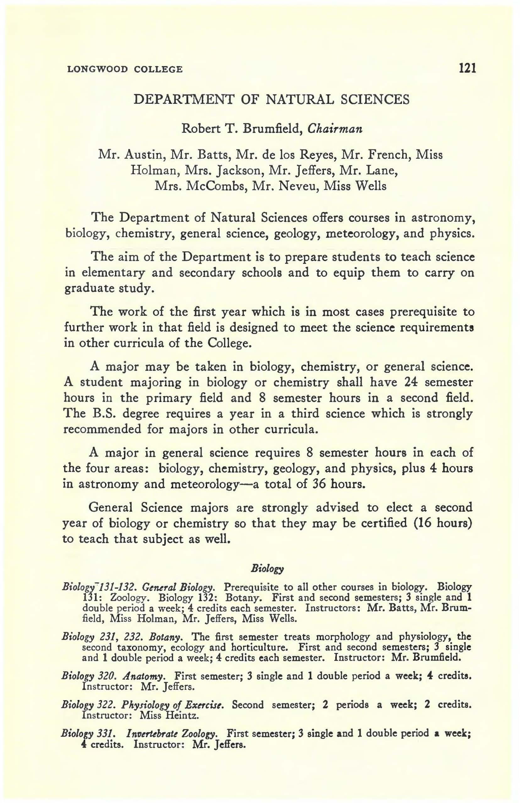 Biology Biology~131-132. General Biology. Prerequisite to all other courses in biology. Biology 131: Zoology. Biology 132: Botany. First and second semesters; 3 single and 1 double period a week; 4 credits each semester. Instructors: Mr. Batts, Mr. Brumfield, Miss Holman, Mr. Jeffers, Miss Wells. Biology 231, 232. Botany. The first semester treats morphology and physiology, the second taxonomy, ecology and horticulture. First and second semesters; 3 single and 1 double period a week; 4 credits each semester. Instructor: Mr. Brumfield. Biology 320. Anatomy. First semester; 3 single and 1 double period a week; 4- credits.