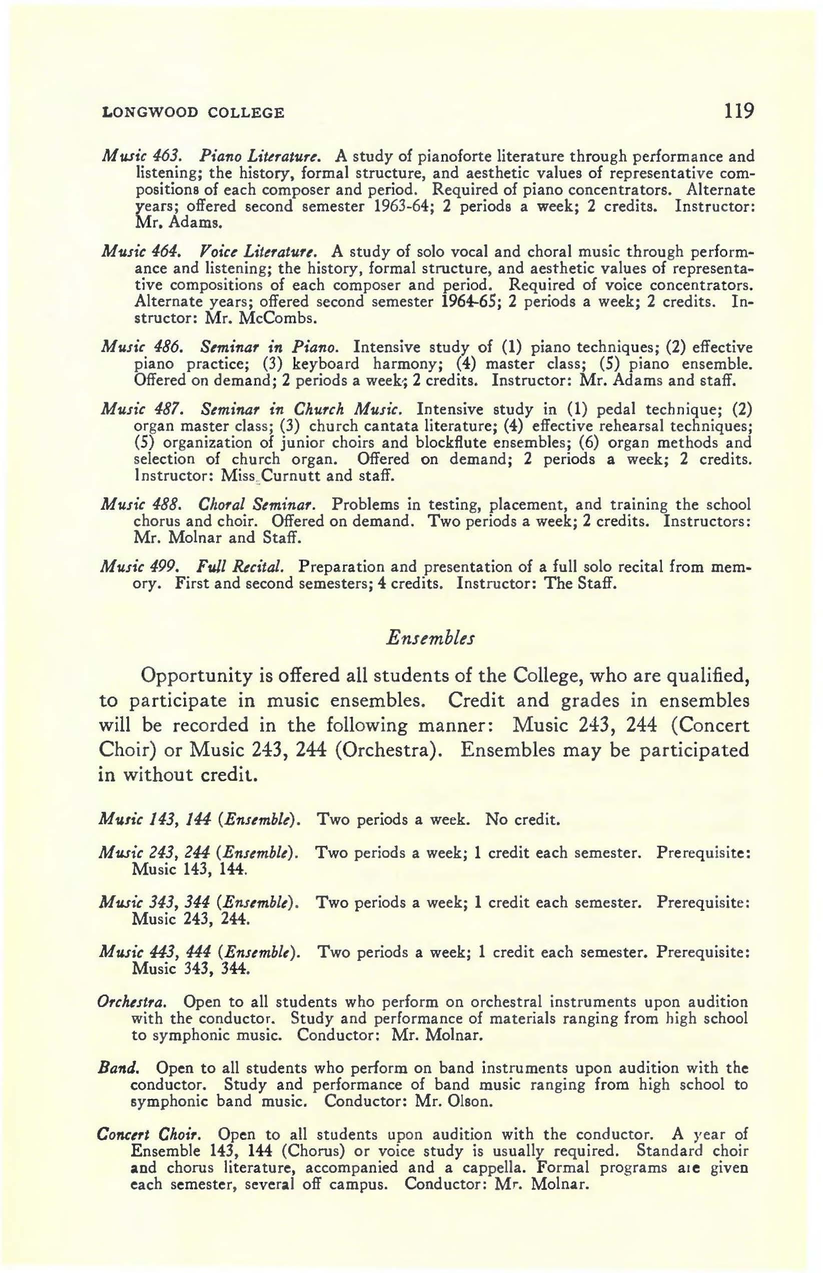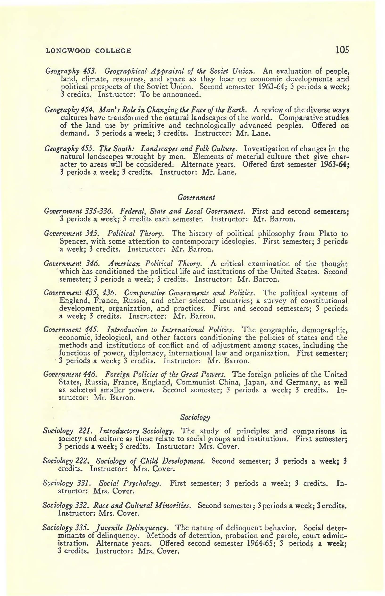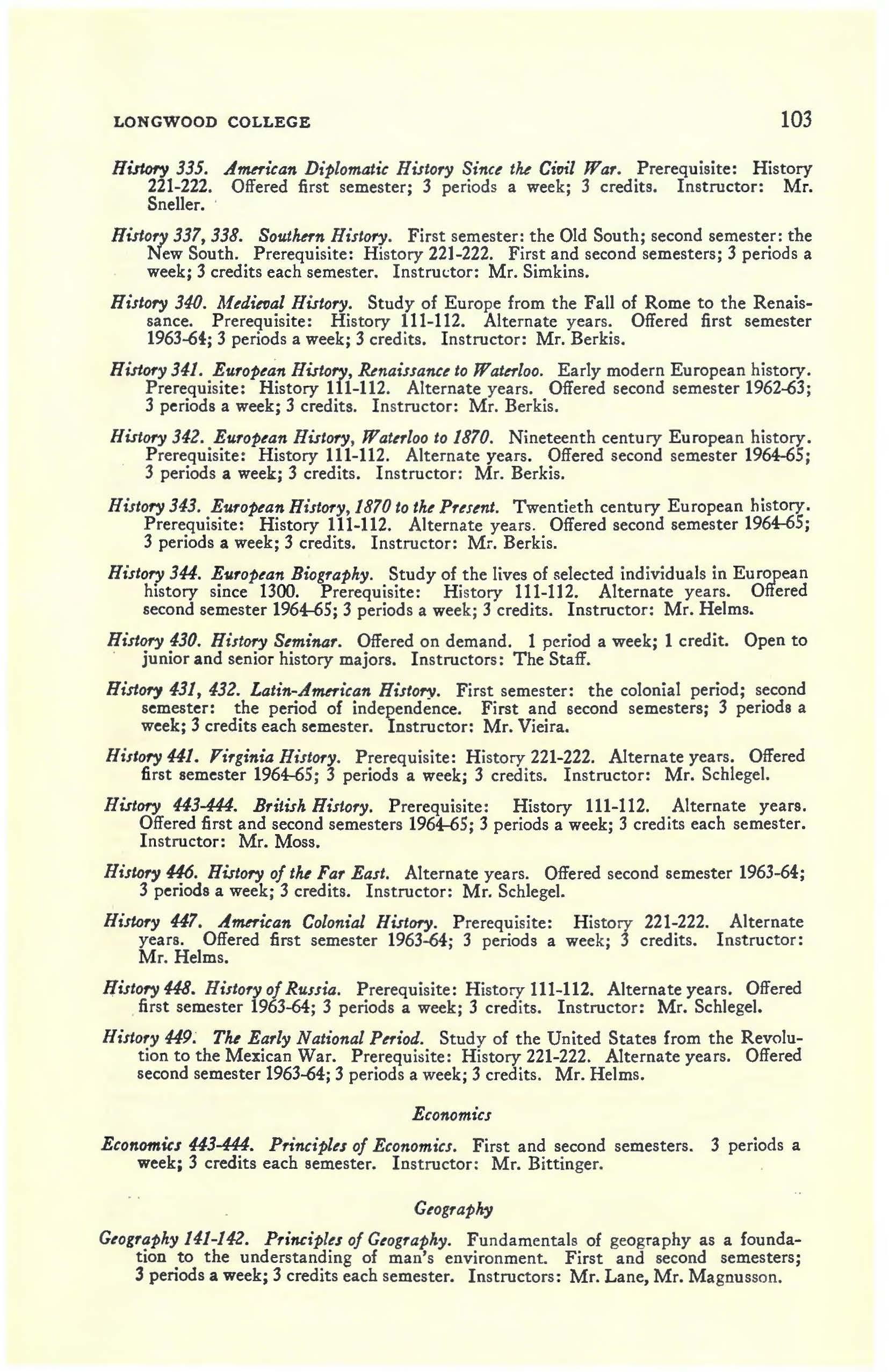 Education 231 or upon recommendation of instructor. Second semester; 3 periods a week; 1 credit. Instructor: Mrs. Landrum. Physical Education 250. History and Principles of Physical Education. Historical survey of the field of physical and health education; present day trends and practices; theoretical concepts and underlying principles. Alternate years. Offered second semester 1963-64 and summer session 1963; 2 periods a week; 2 credits. Instructors: